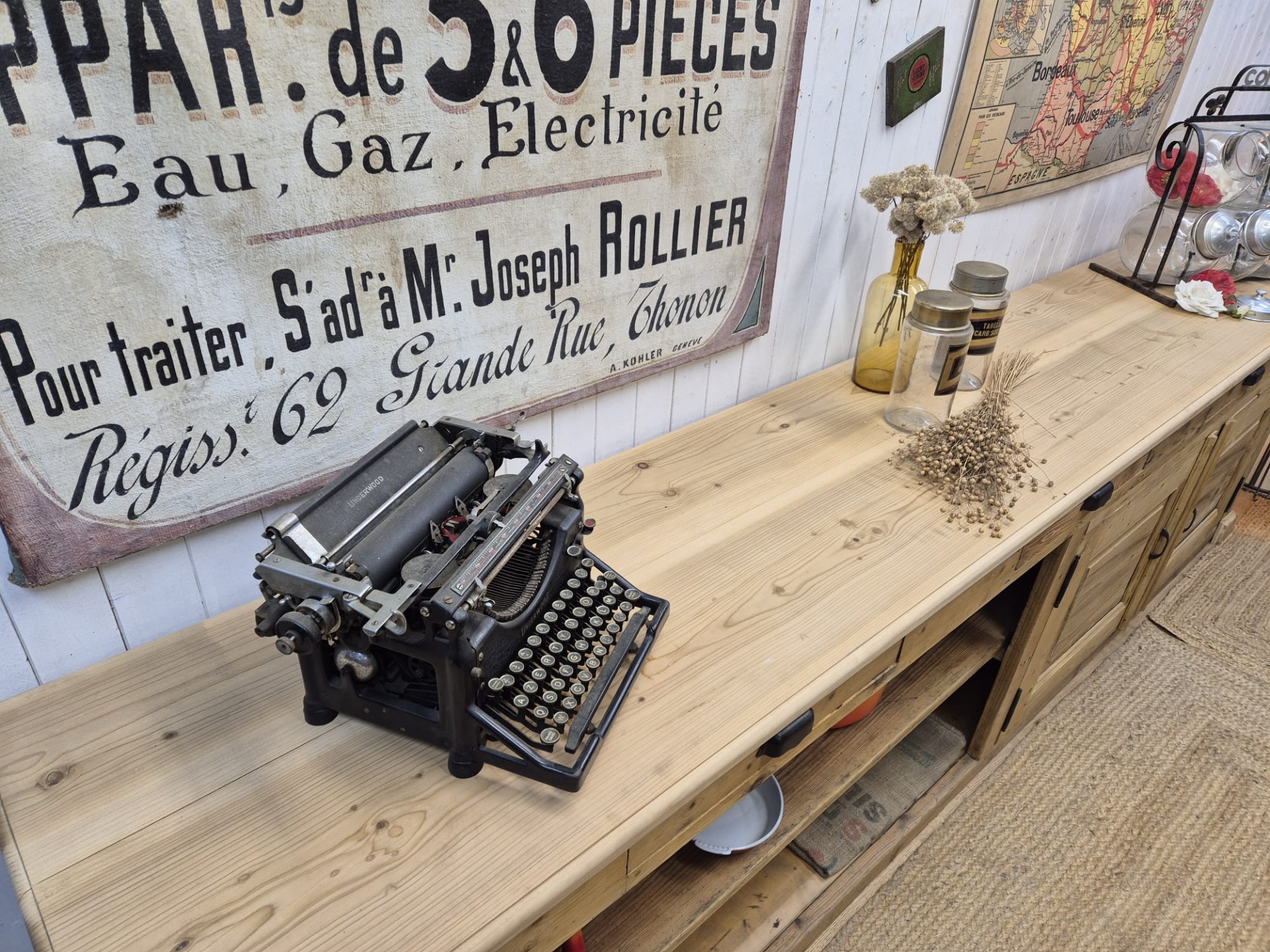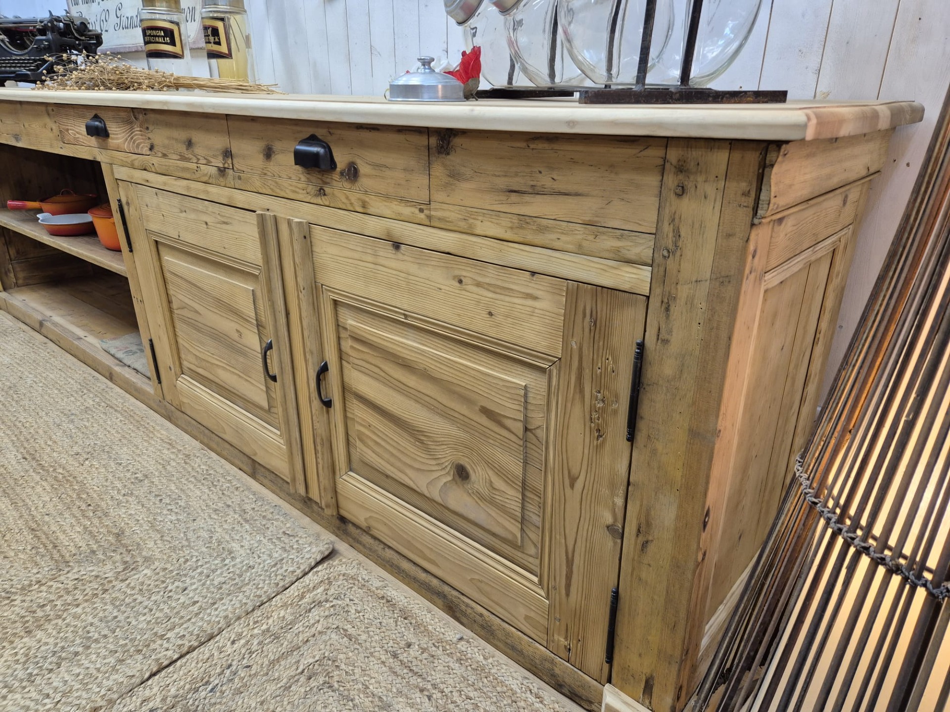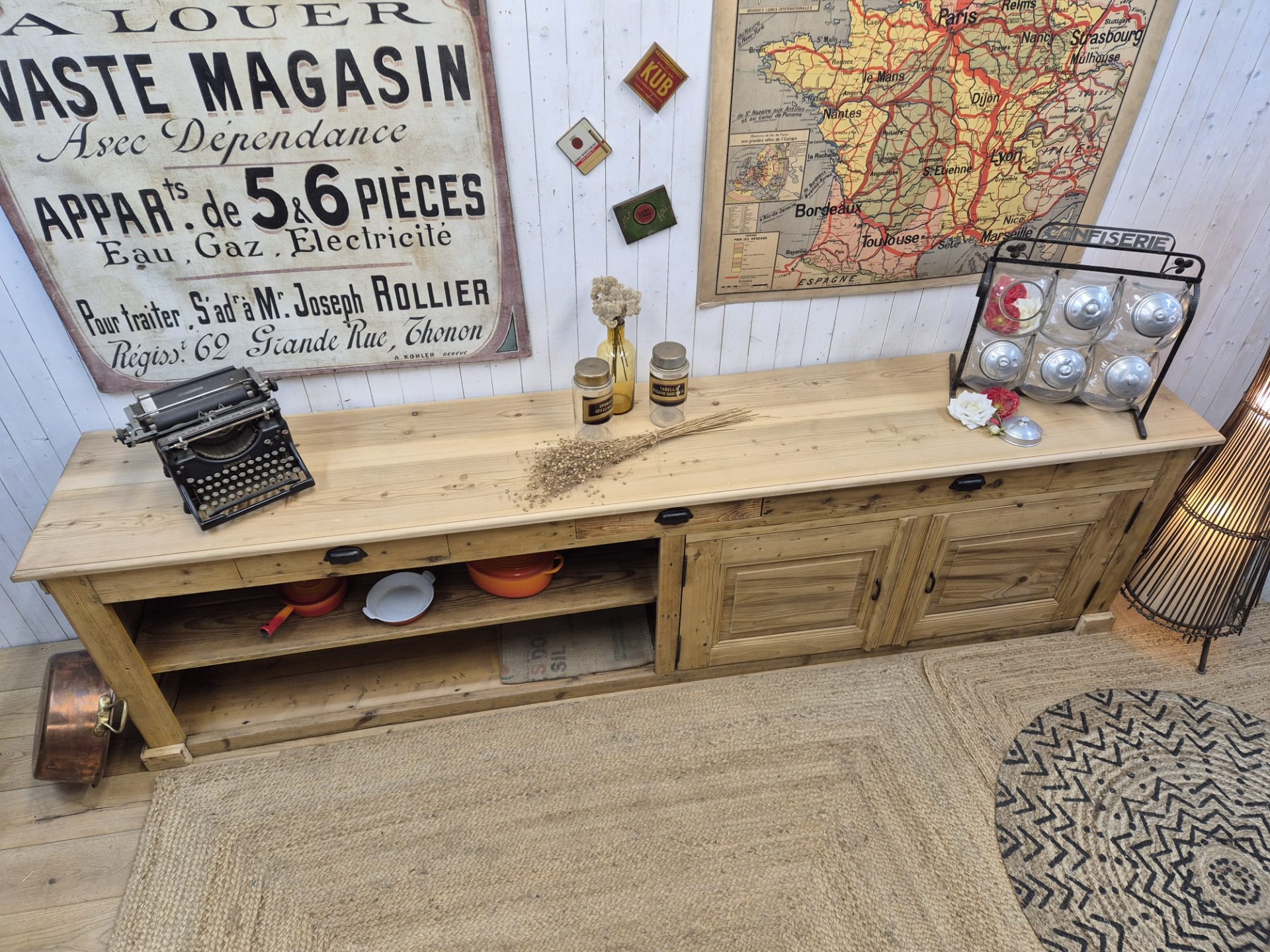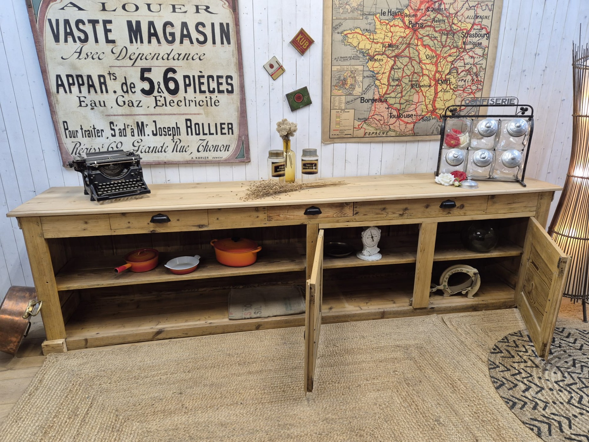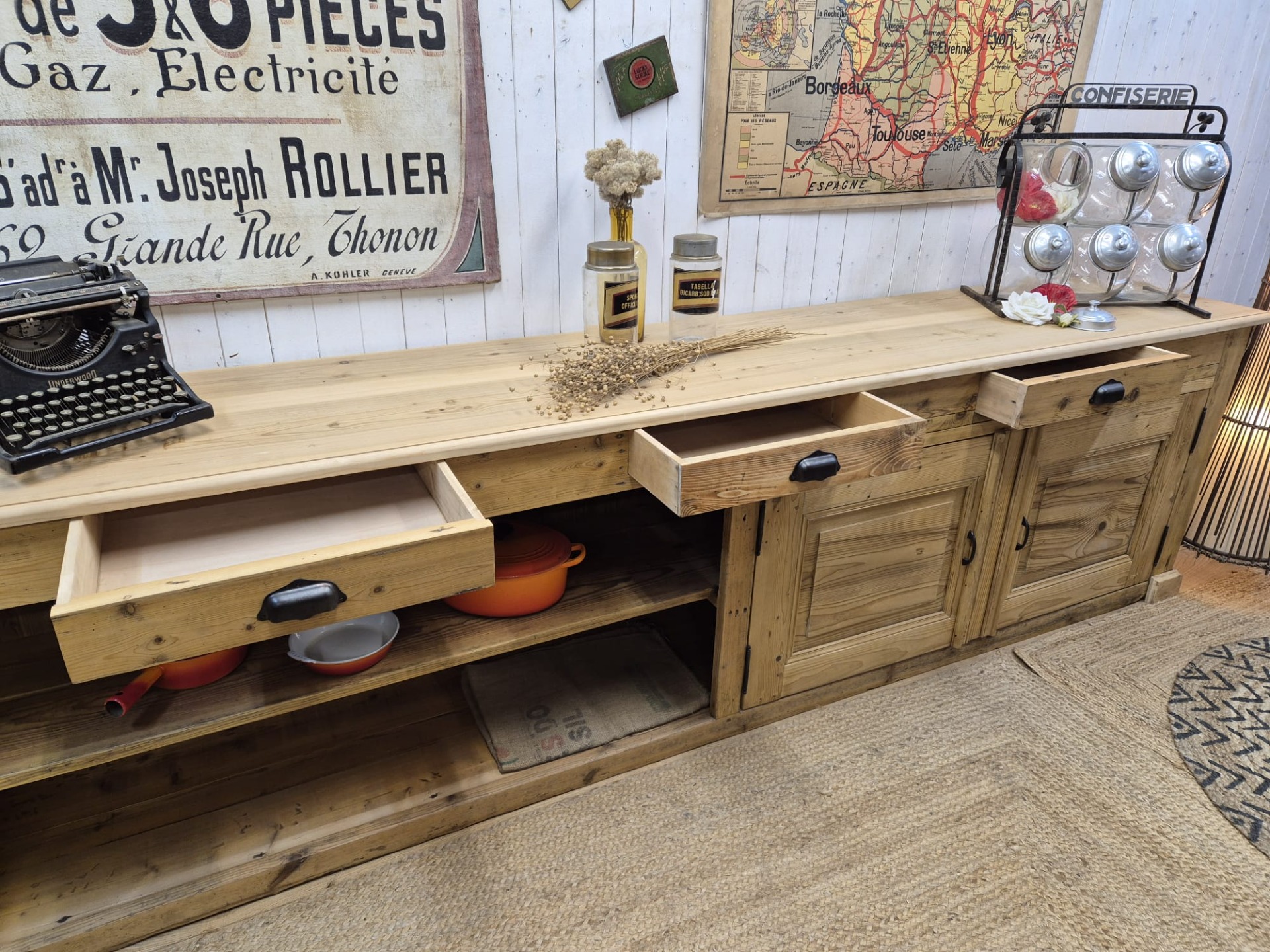 Très joli et ancien comptoir d'épicerie entièrement restauré. Il dispose de trois tiroirs avec leurs poignées coquilles d'origine, d'une étagère sur toute sa longueur avec un côté fermé par deux portes battantes et d'un très joli plateau en cèdre.