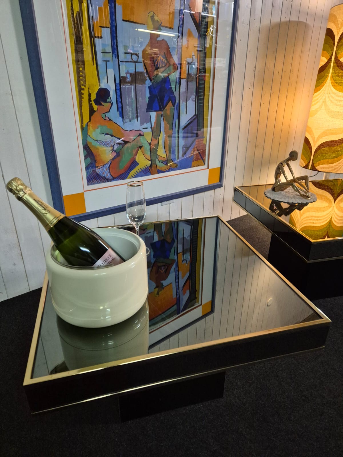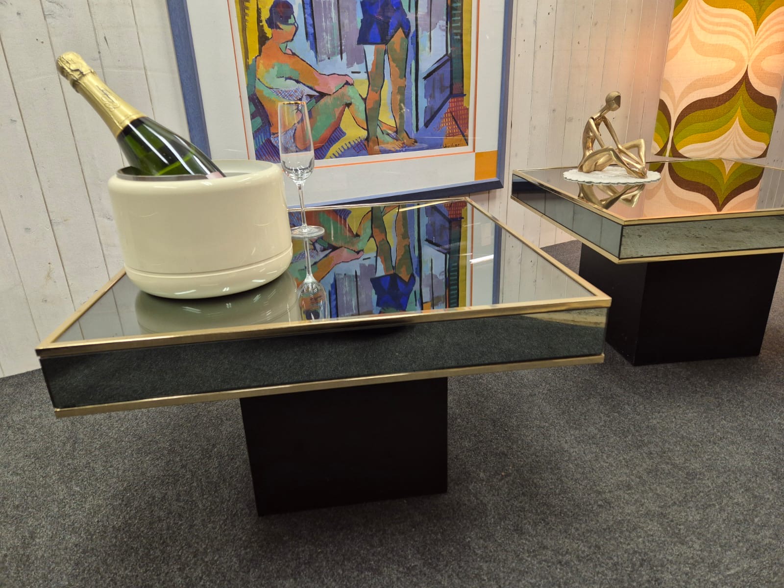 Bout de canapé signé Willy Rizzo pour Cidue , années 70.Très design, en acier laitonné et verre miroité fumé.Un petit éclat sur un bord d'un des deux mais vraiment léger.Dimensions :60x60cm , hauteur 40cm