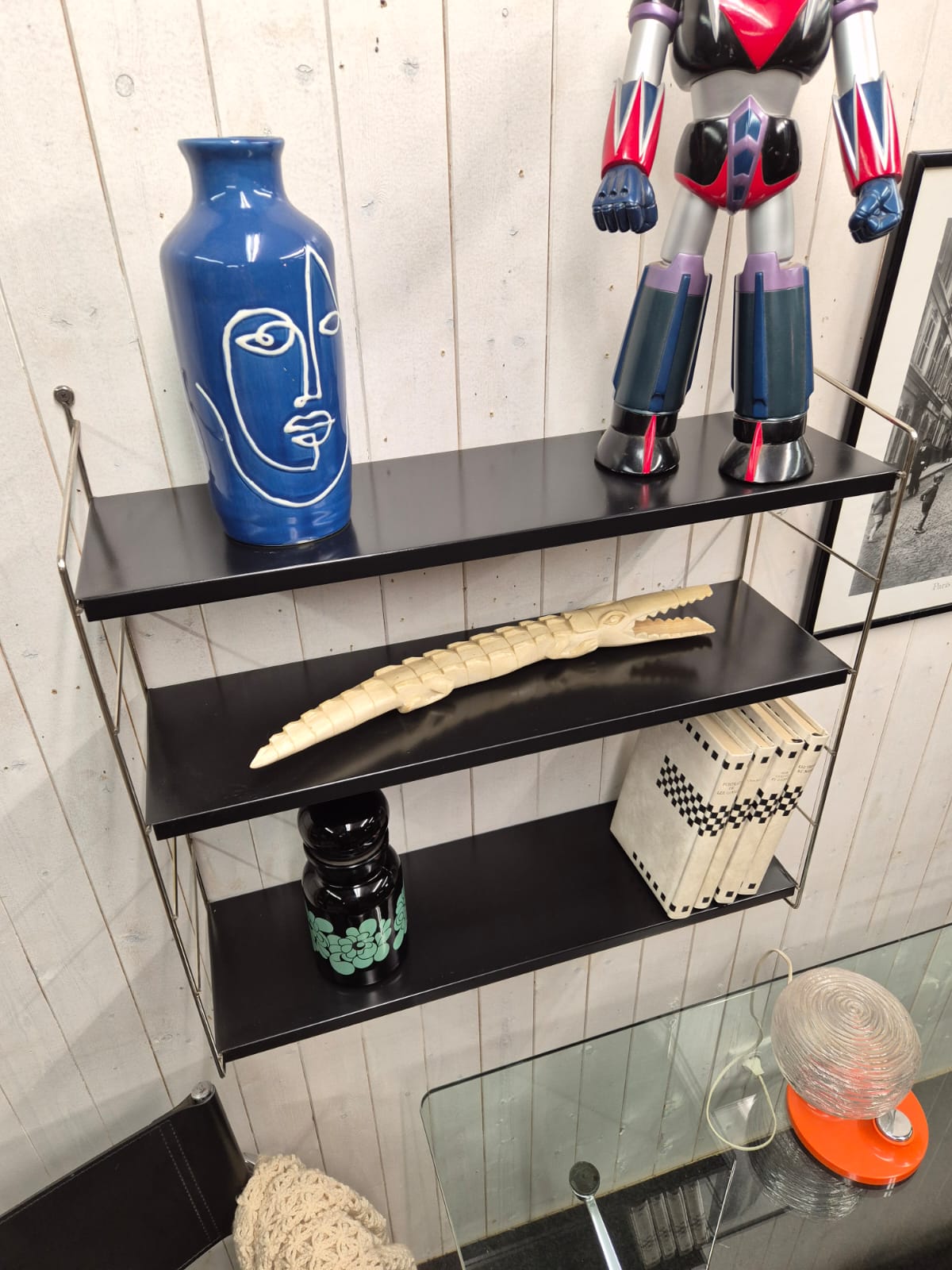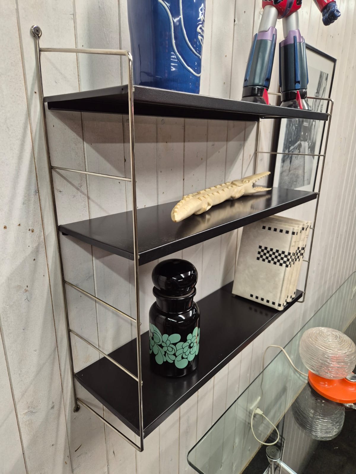 Très belle étagère string en métal chromé et noir, années 60.Elle dispose de deux échelles en métal chromé ainsi que de 3 étagères métal noir.Dimensions :Hauteur 66cmLargeur 66cmProfondeur 20cm