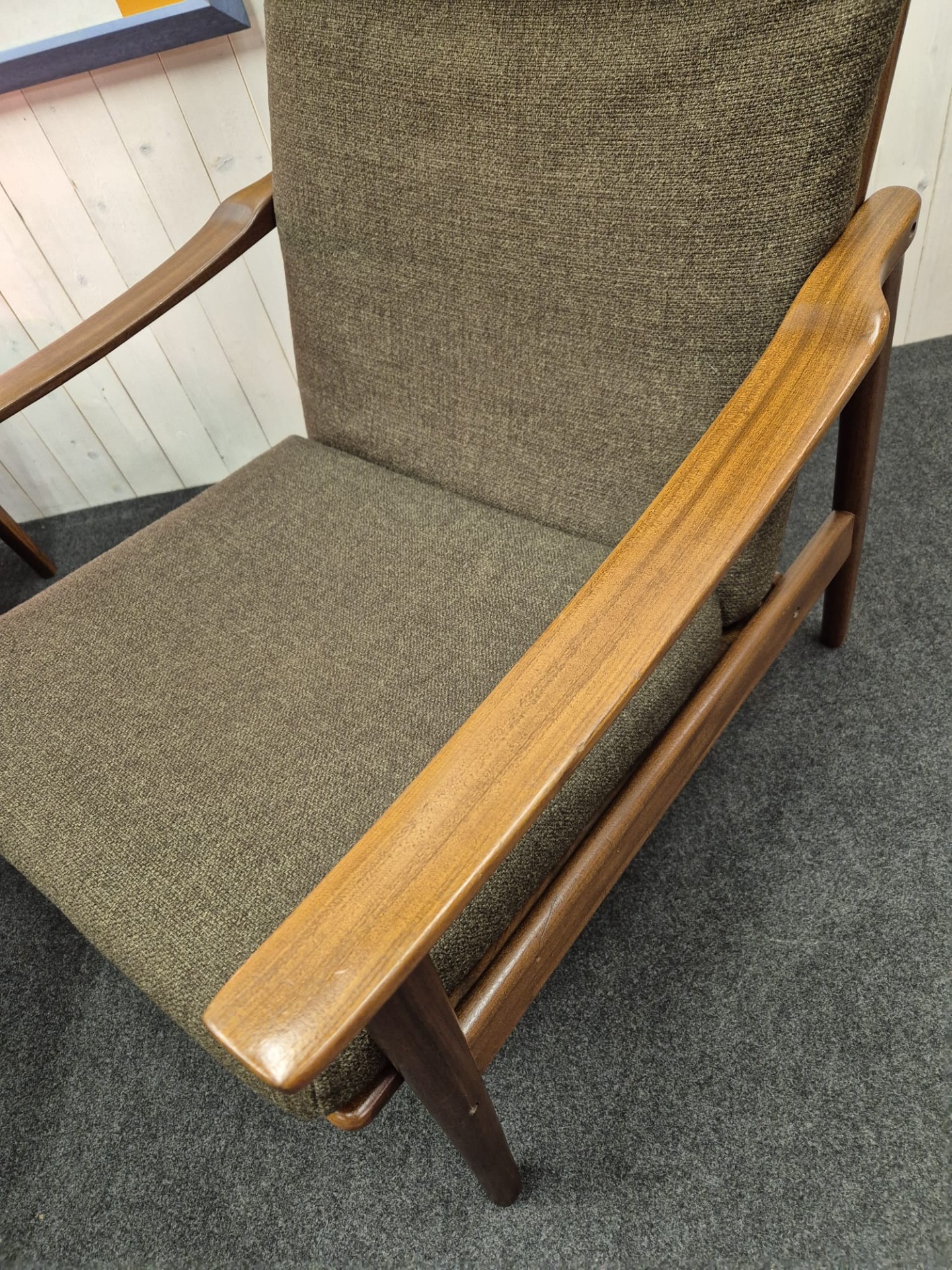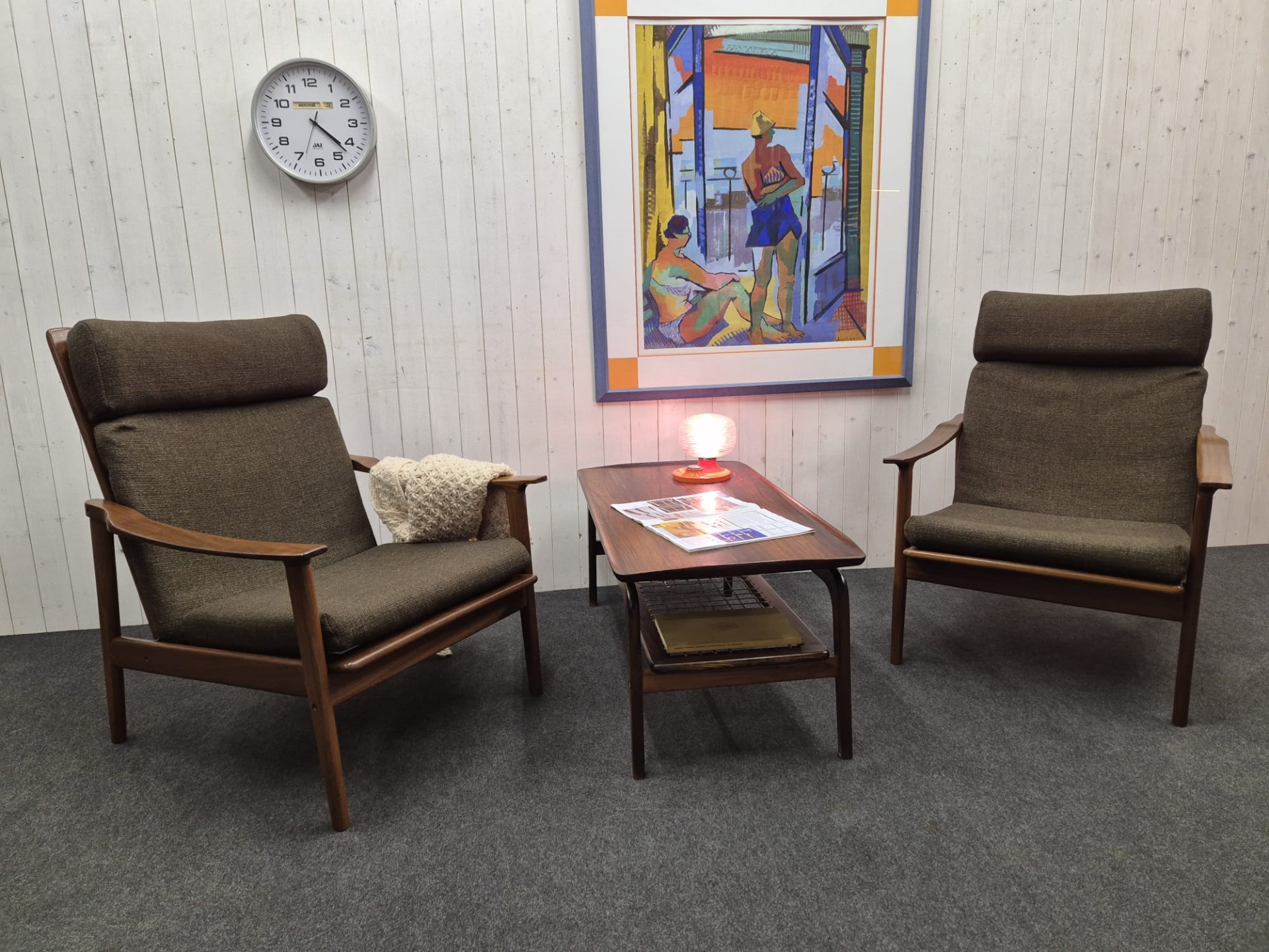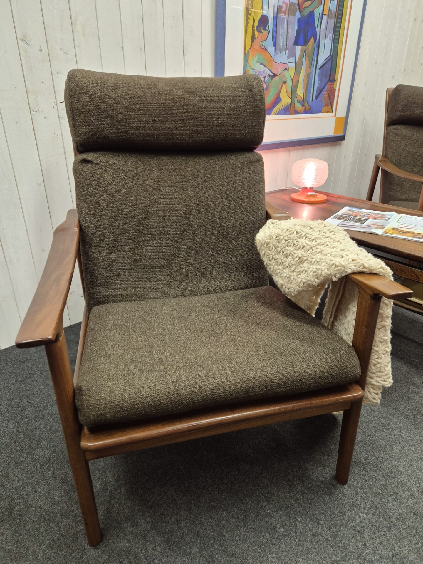 Ensemble de deux fauteuils scandinave en teck, années 60.Les deux sont en très bon état général. Les parties teck sont impeccables et les coussins sont propres.Disponible à la pièce.Dimensions :H90 x L70 x P70