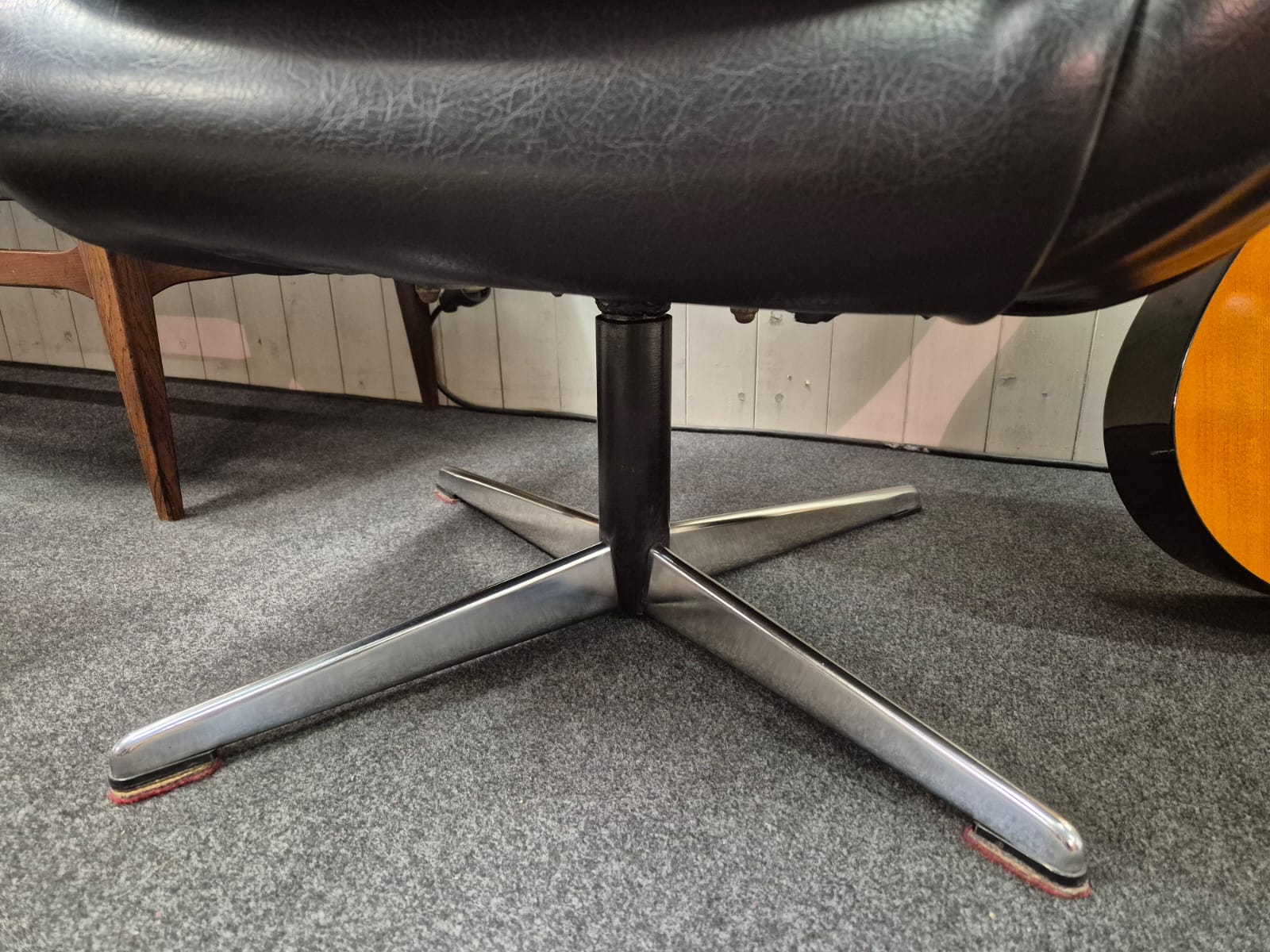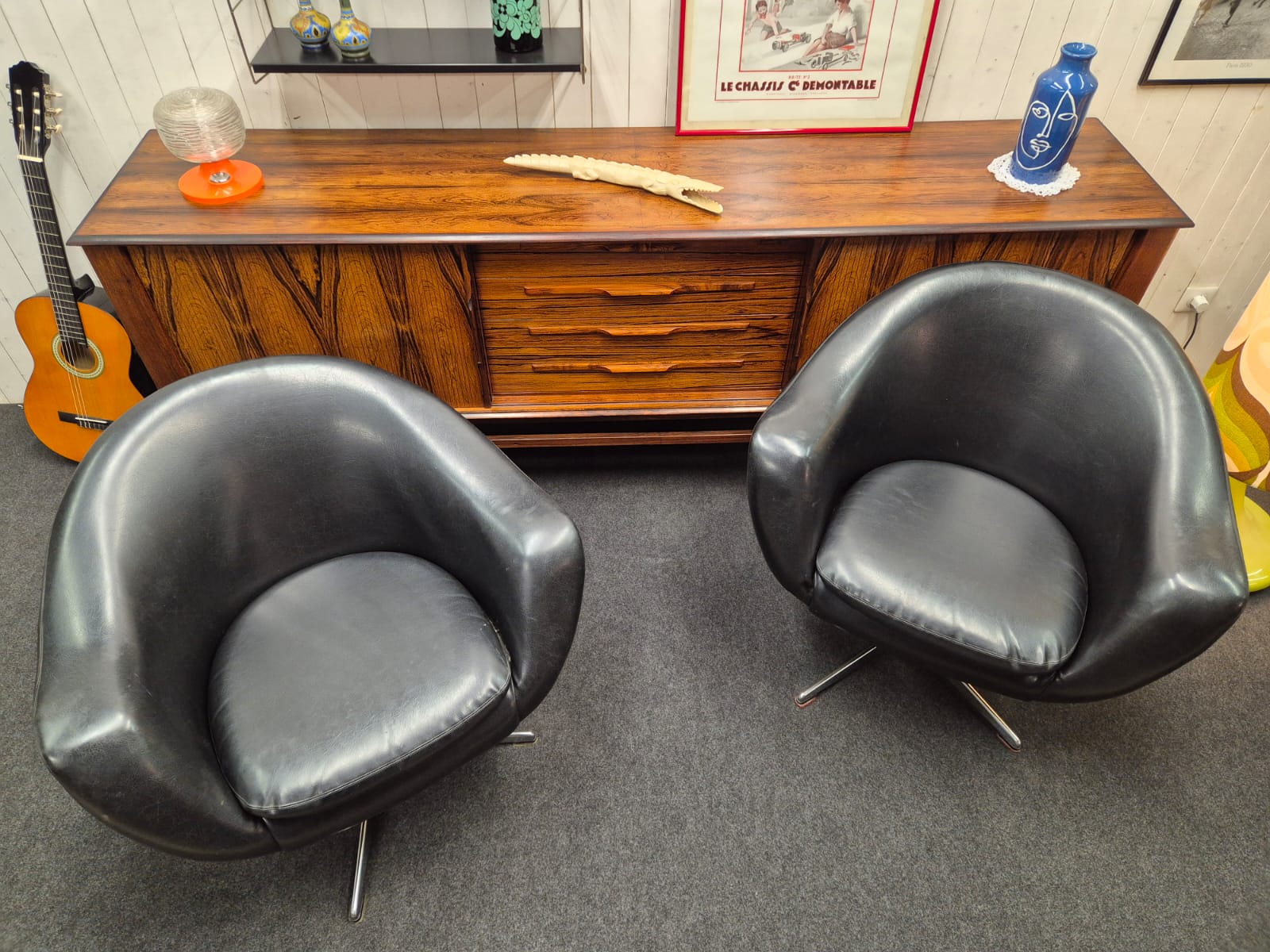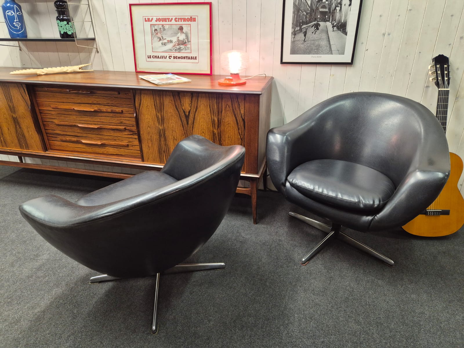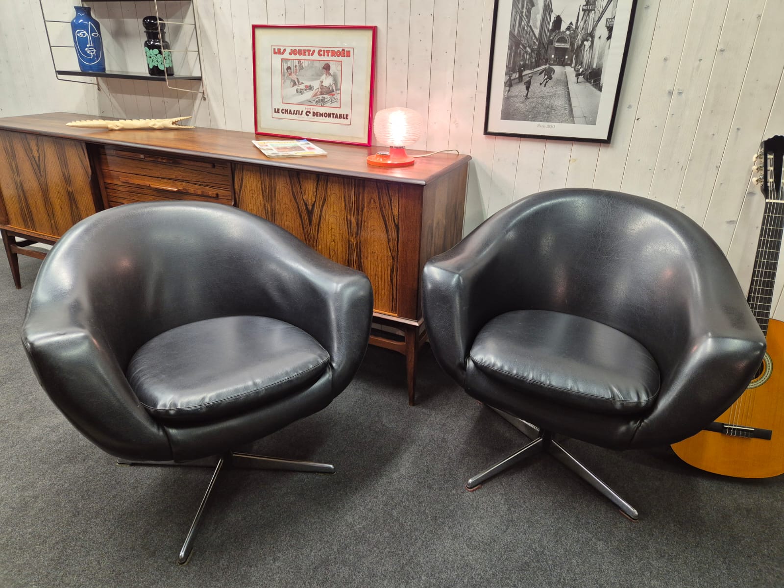 Joli duo de fauteuils Coquille Ballon pivotant, années 60/70, design scandinave dans le goût de Karl Eric Klote pour Overman.Les deux fauteuils sont en bon état général (skaï et piètement chrome )H76 x L83 x P68