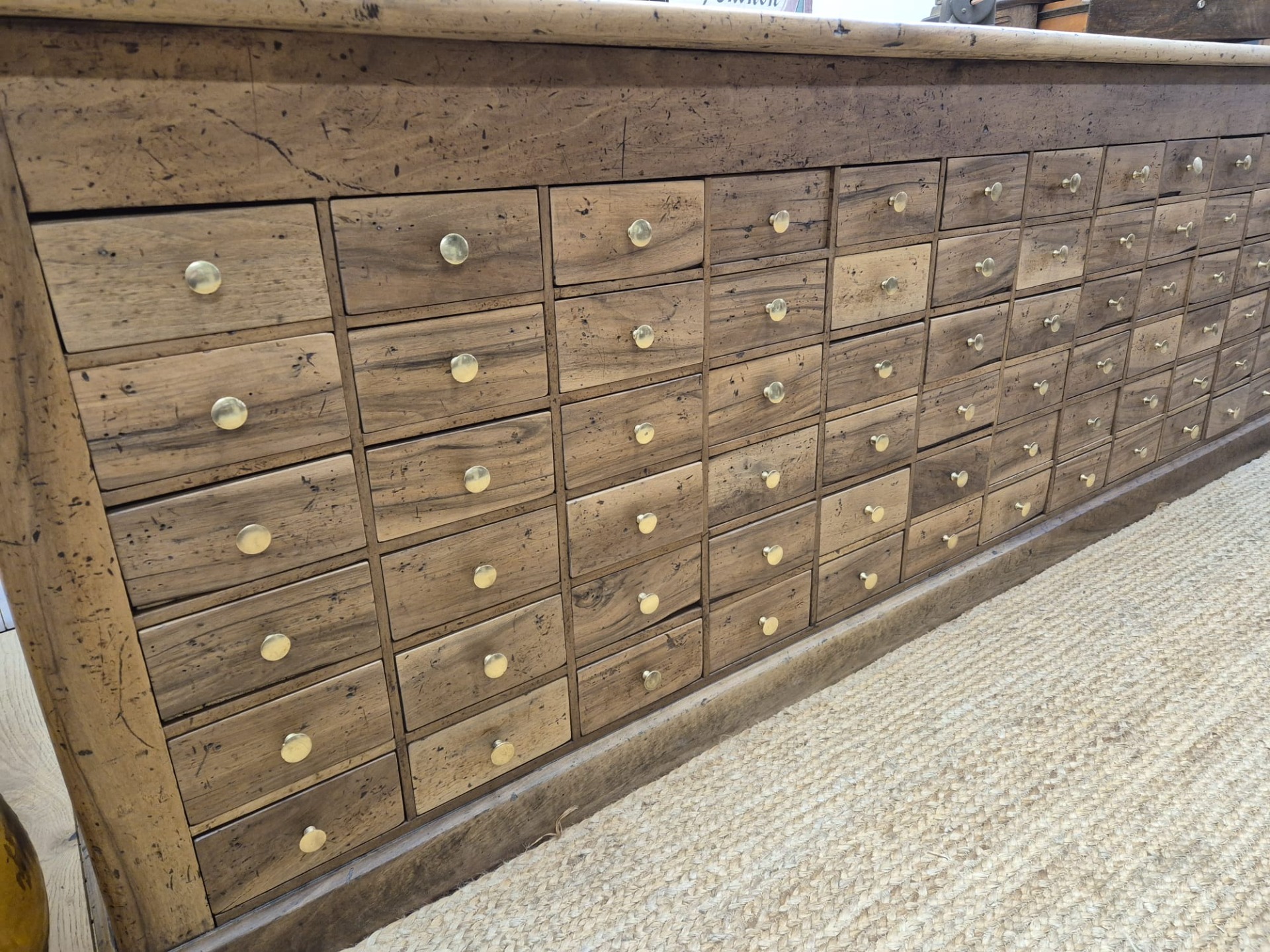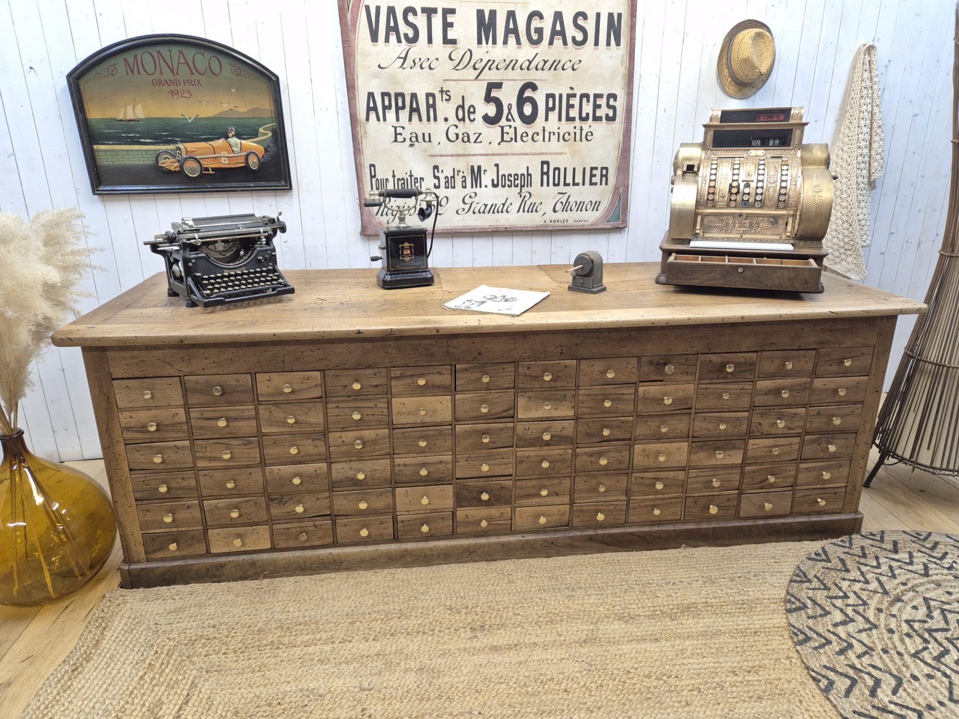 Entièrement restauré, il dispose de 88 tiroirs, 72 petits d'un côté et 16 gros de l'autre. L'ensemble a ses poignées laiton d'origine.