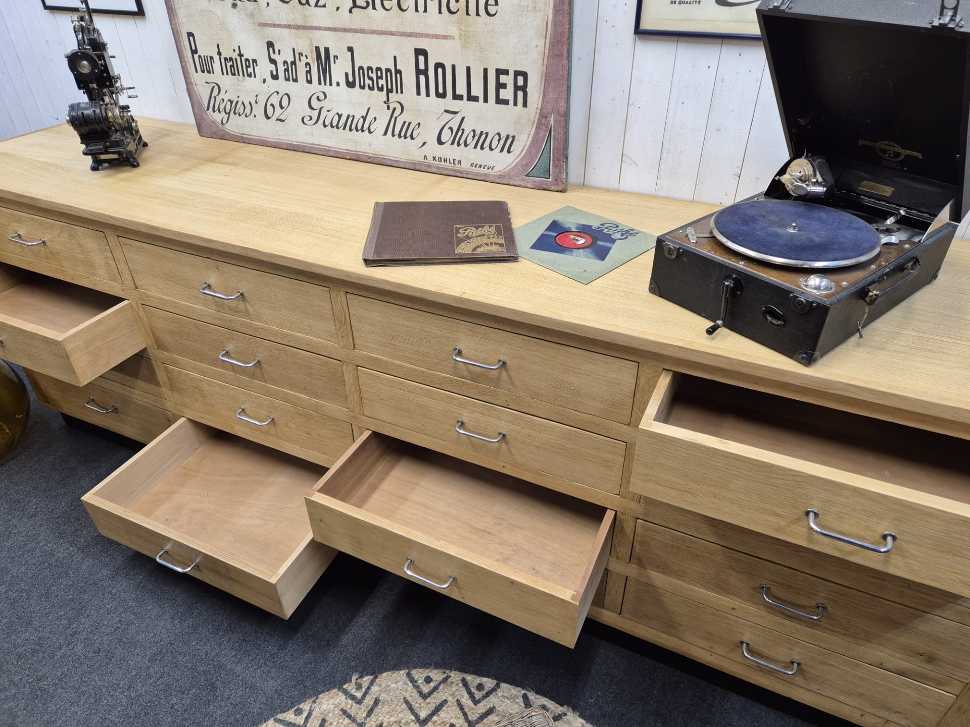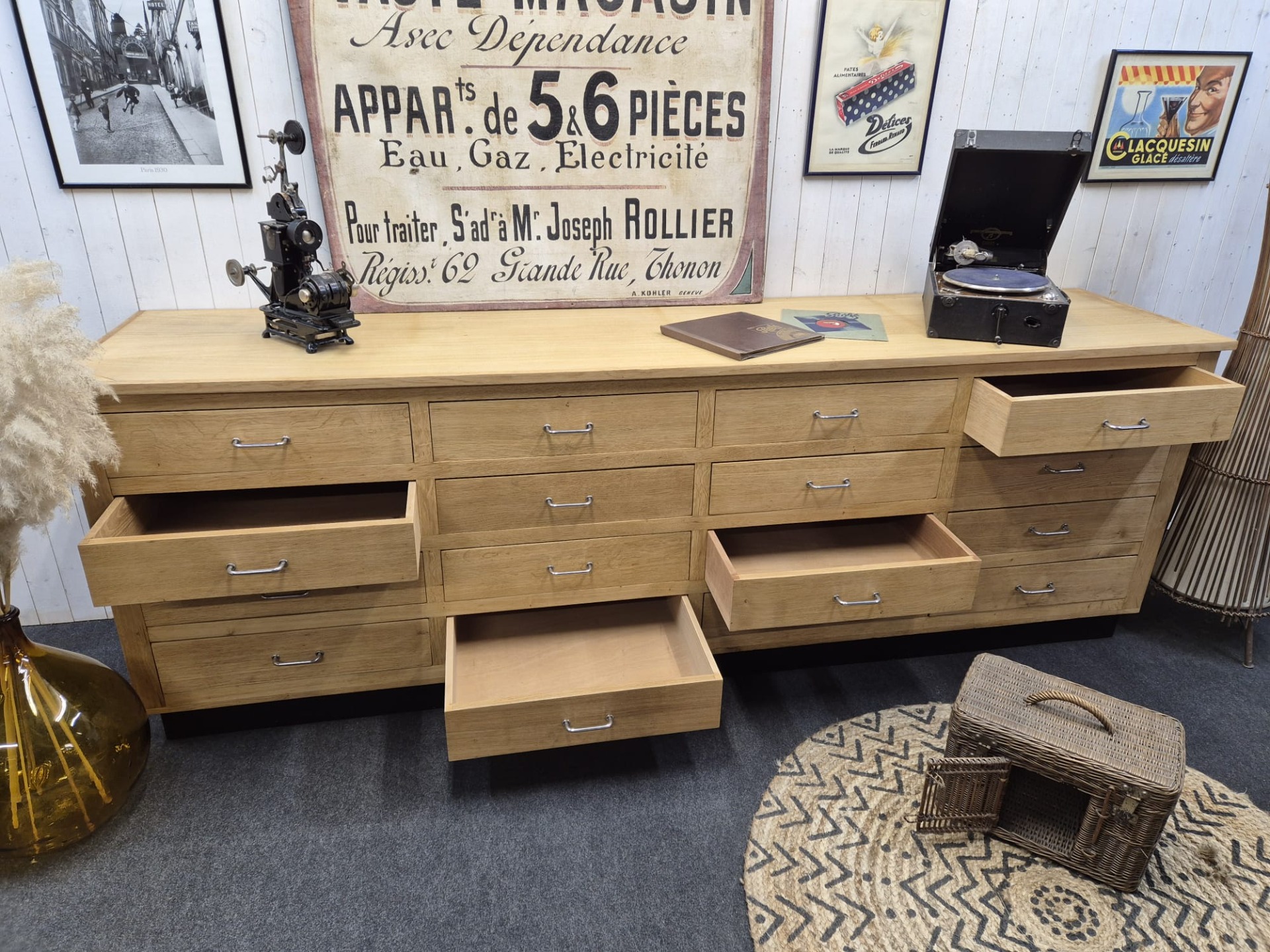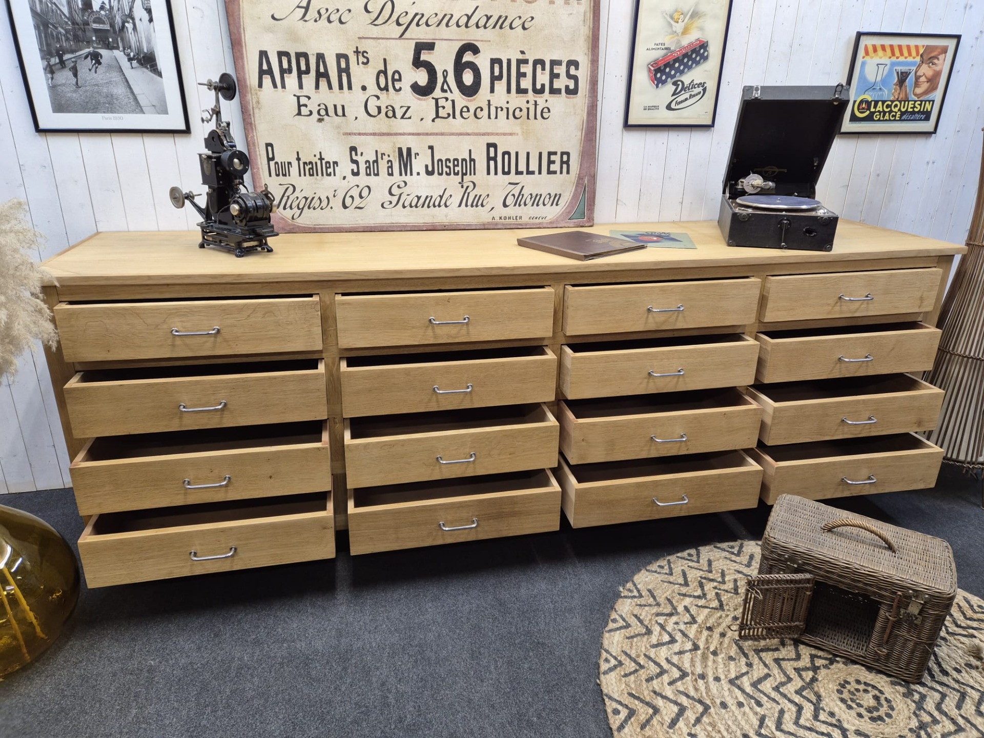 Il dispose de 16 grands tiroirs avec leurs poignées d'origine et de belles dimensions :