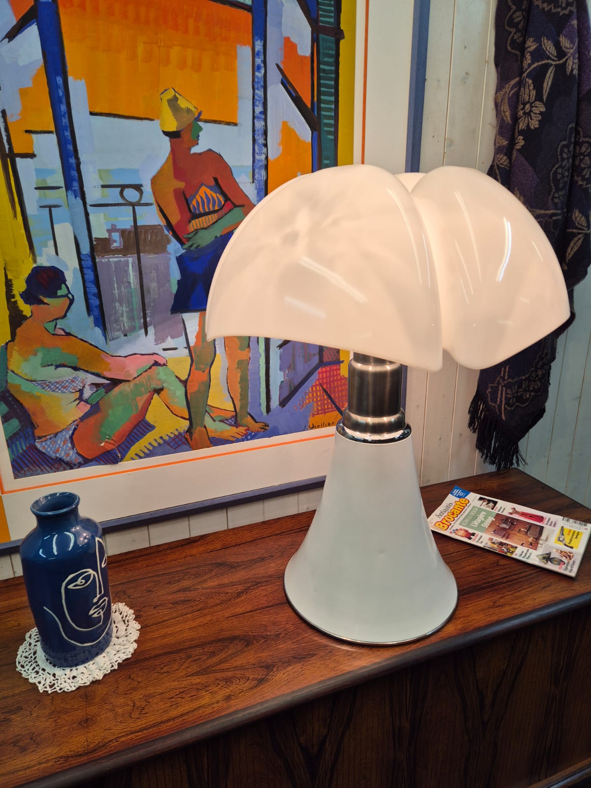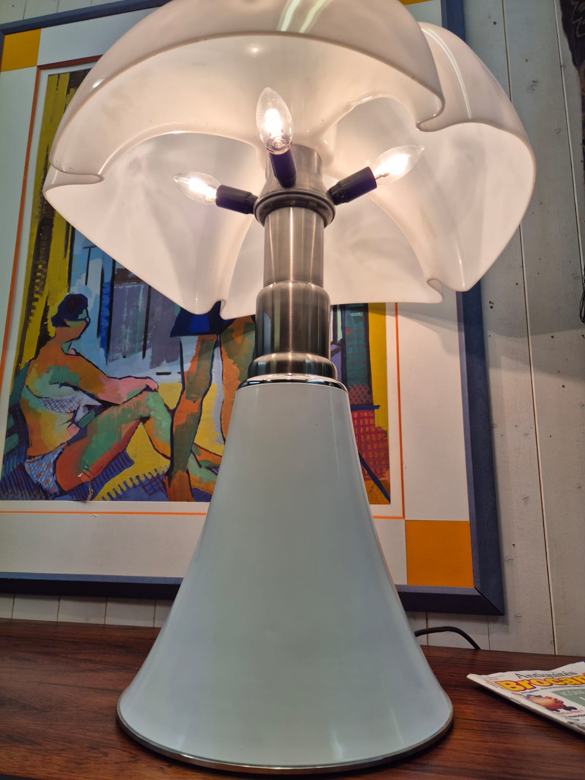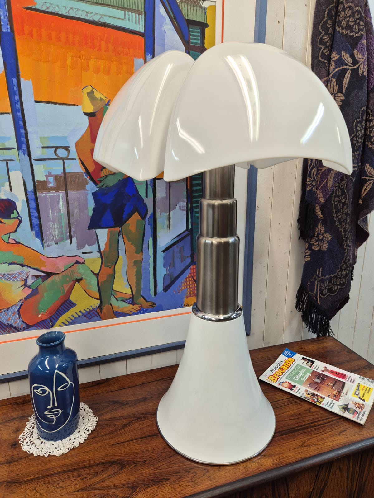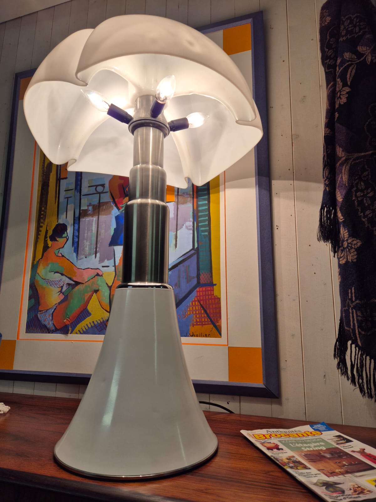 Une base télescopique pour régler la hauteur et son abat-jour déployé comme des ailes de chauves-souris, d'où son nom Pipistrello en italien. Avec ses courbes féminines, elle séduit le monde entier en un éclair. Sa créatrice Gae Aulenti pour Martinelli Luce. Grand modèle télescopique des années 70.
