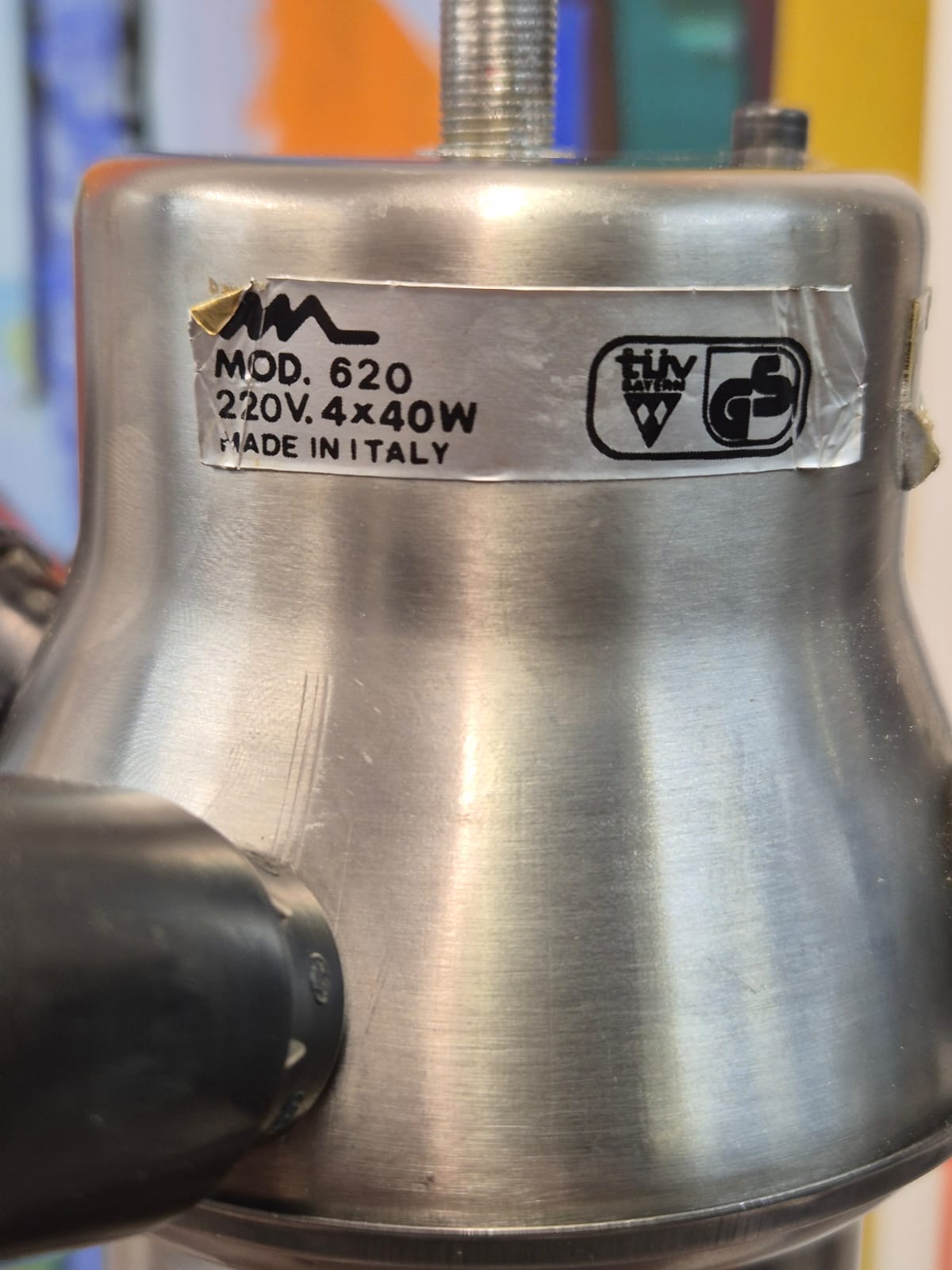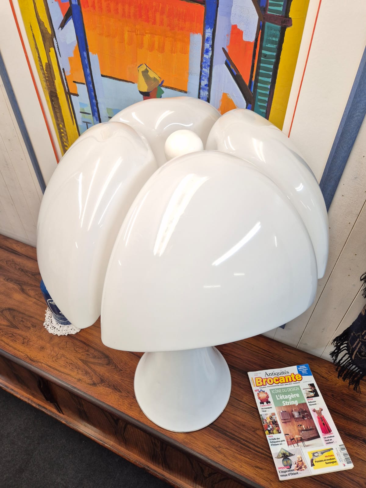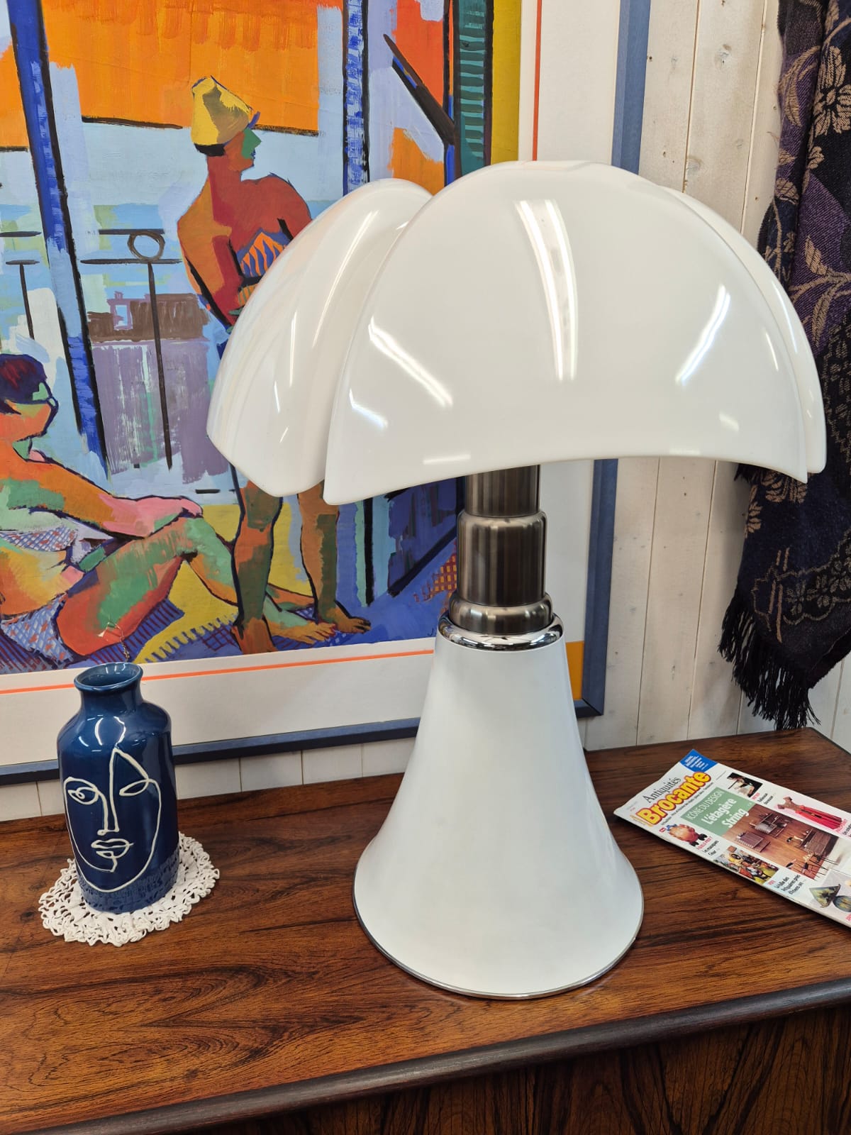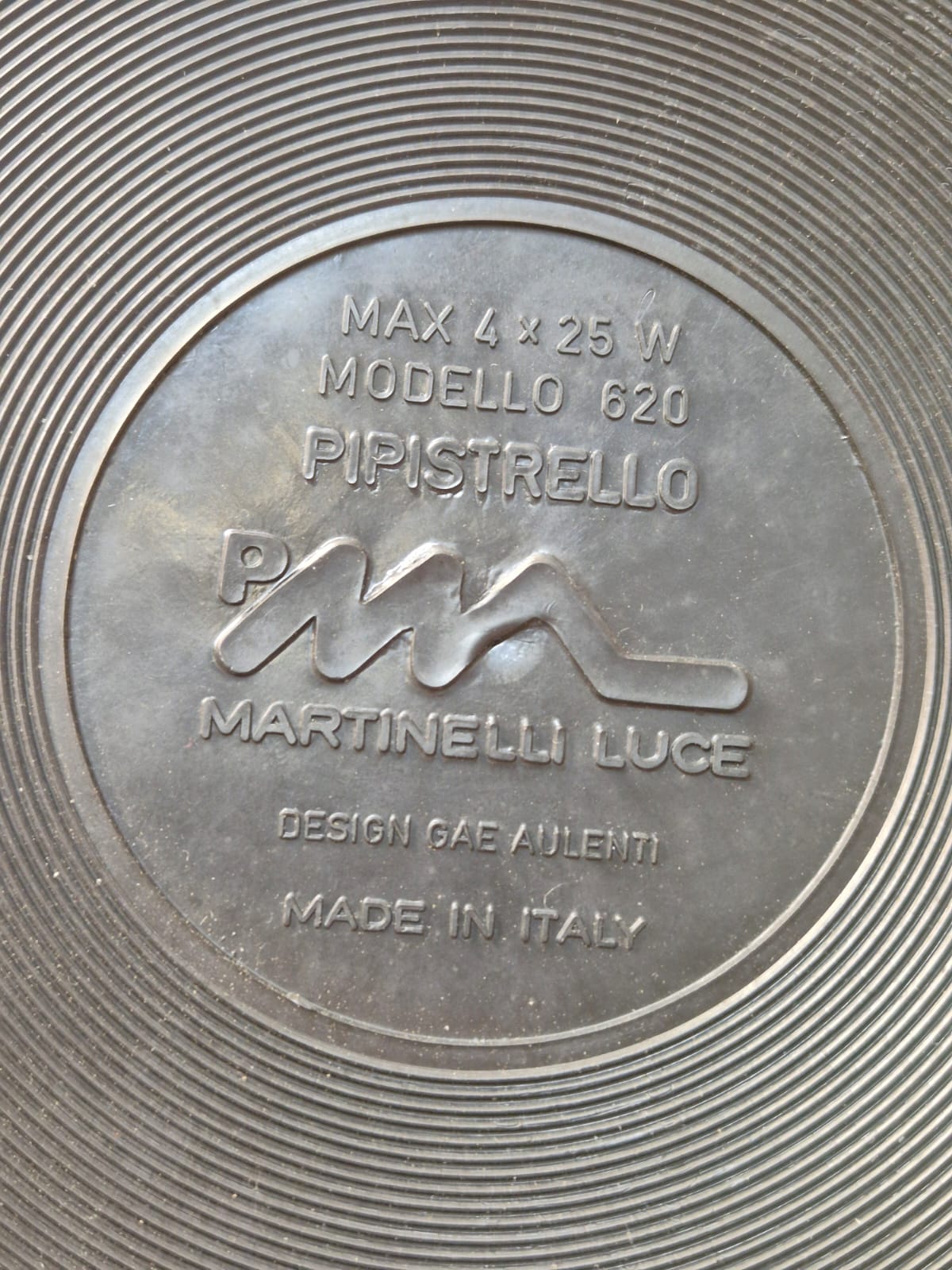 Une base télescopique pour régler la hauteur et son abat-jour déployé comme des ailes de chauves-souris, d'où son nom Pipistrello en italien. Avec ses courbes féminines, elle séduit le monde entier en un éclair. Sa créatrice Gae Aulenti pour Martinelli Luce. Grand modèle télescopique des années 70.