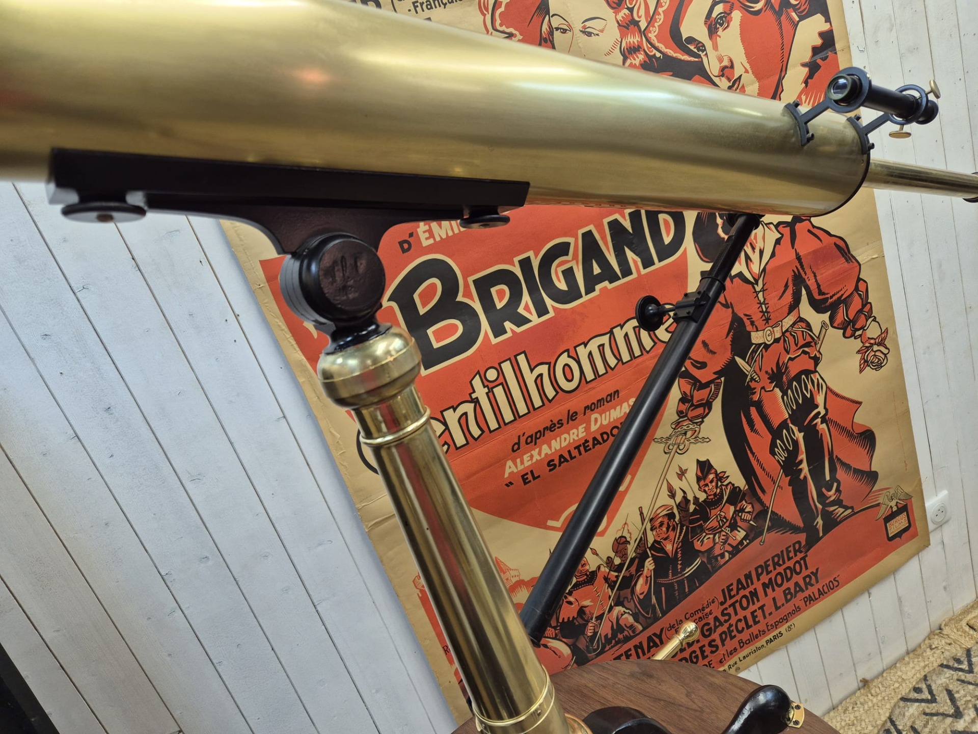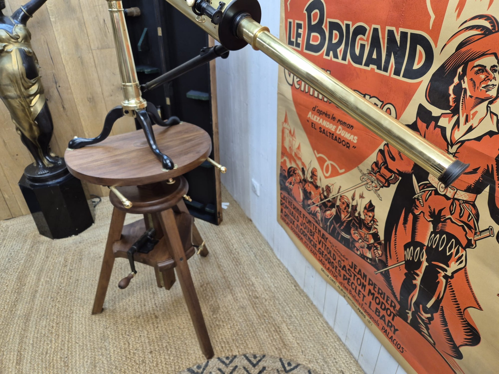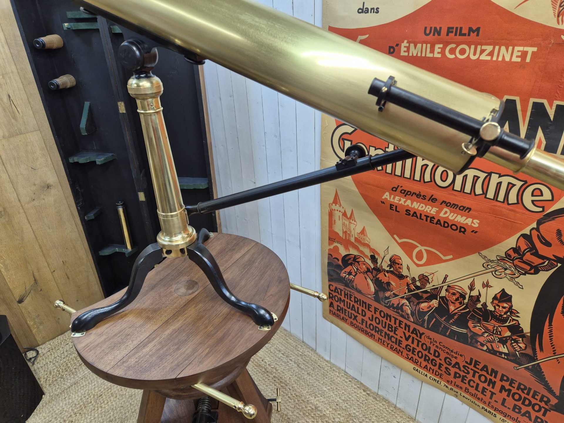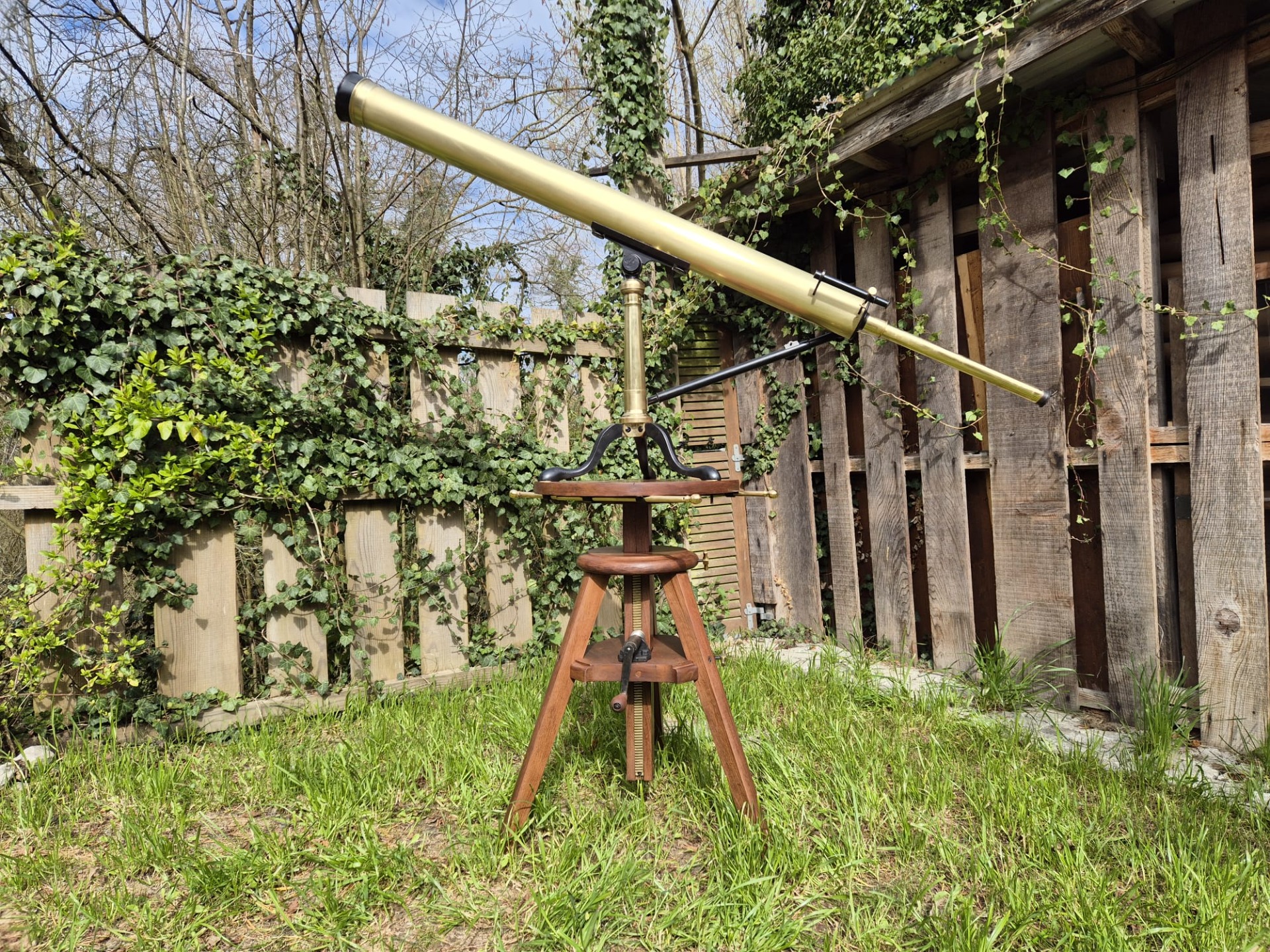 The set is incredibly and fully restored (telescope and stand) and functional. The telescope is made of brass and the stand of walnut.