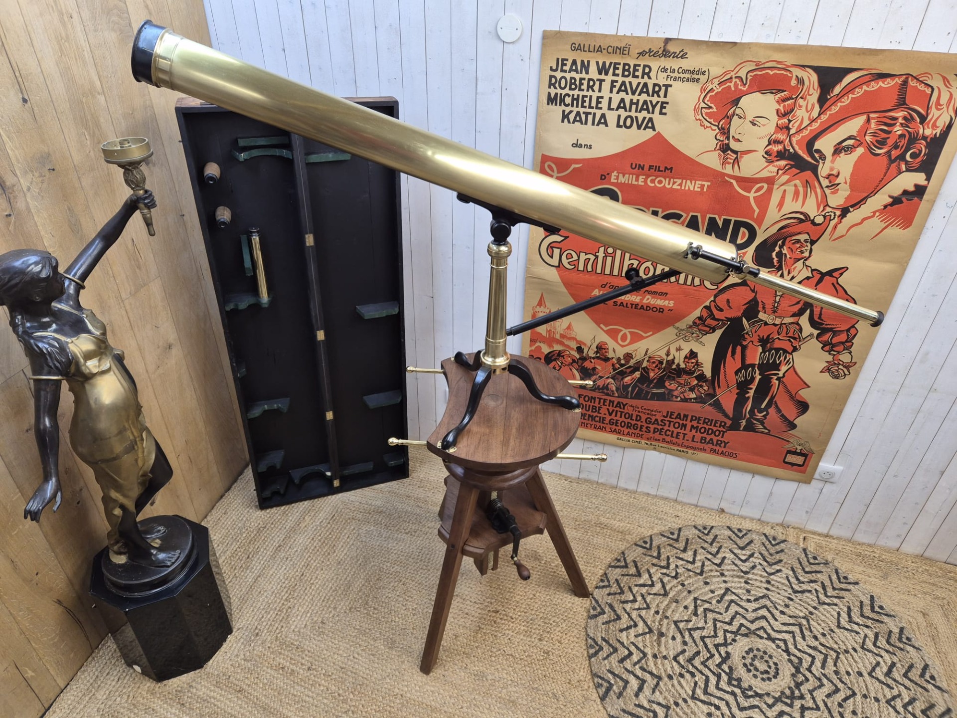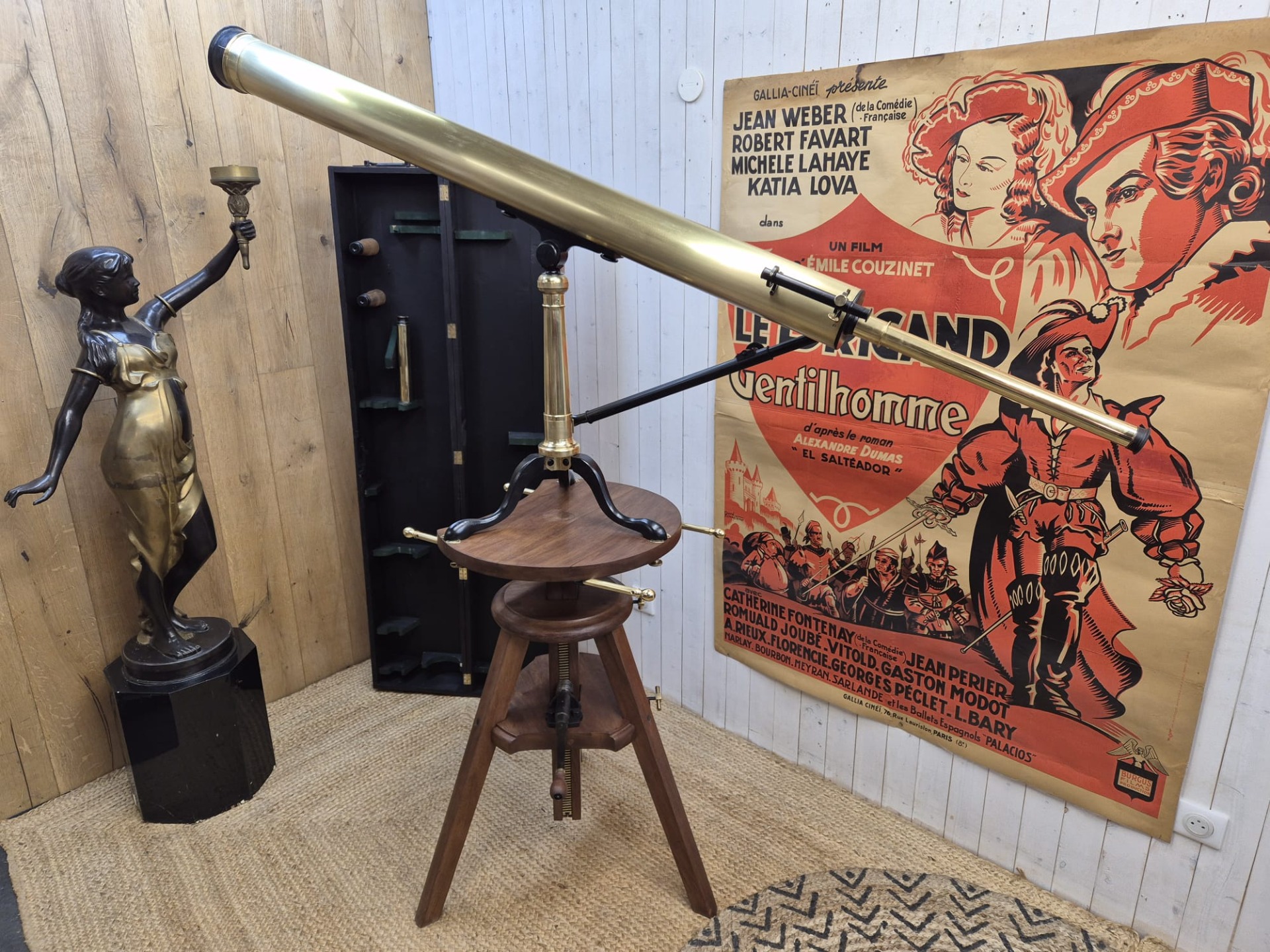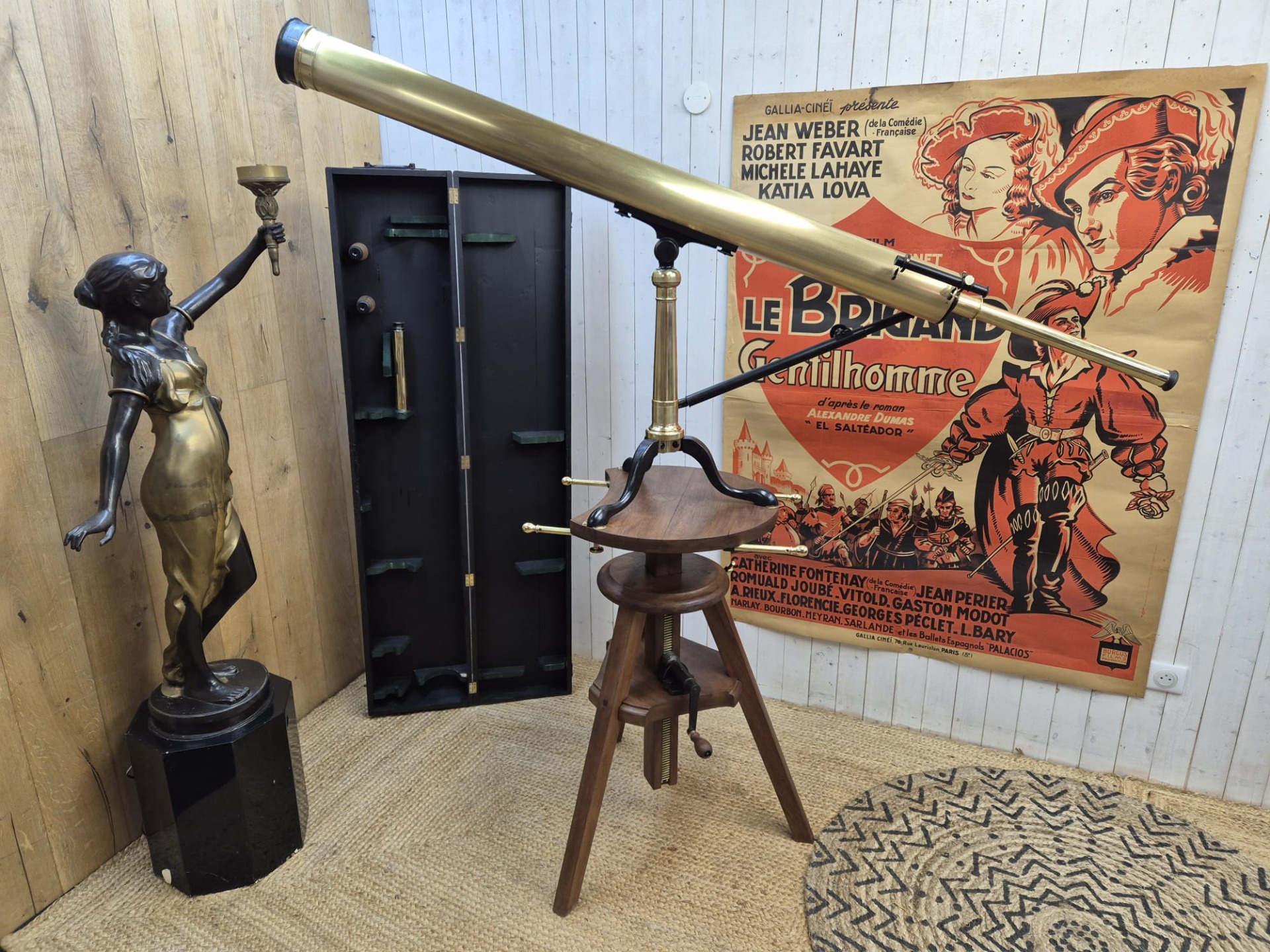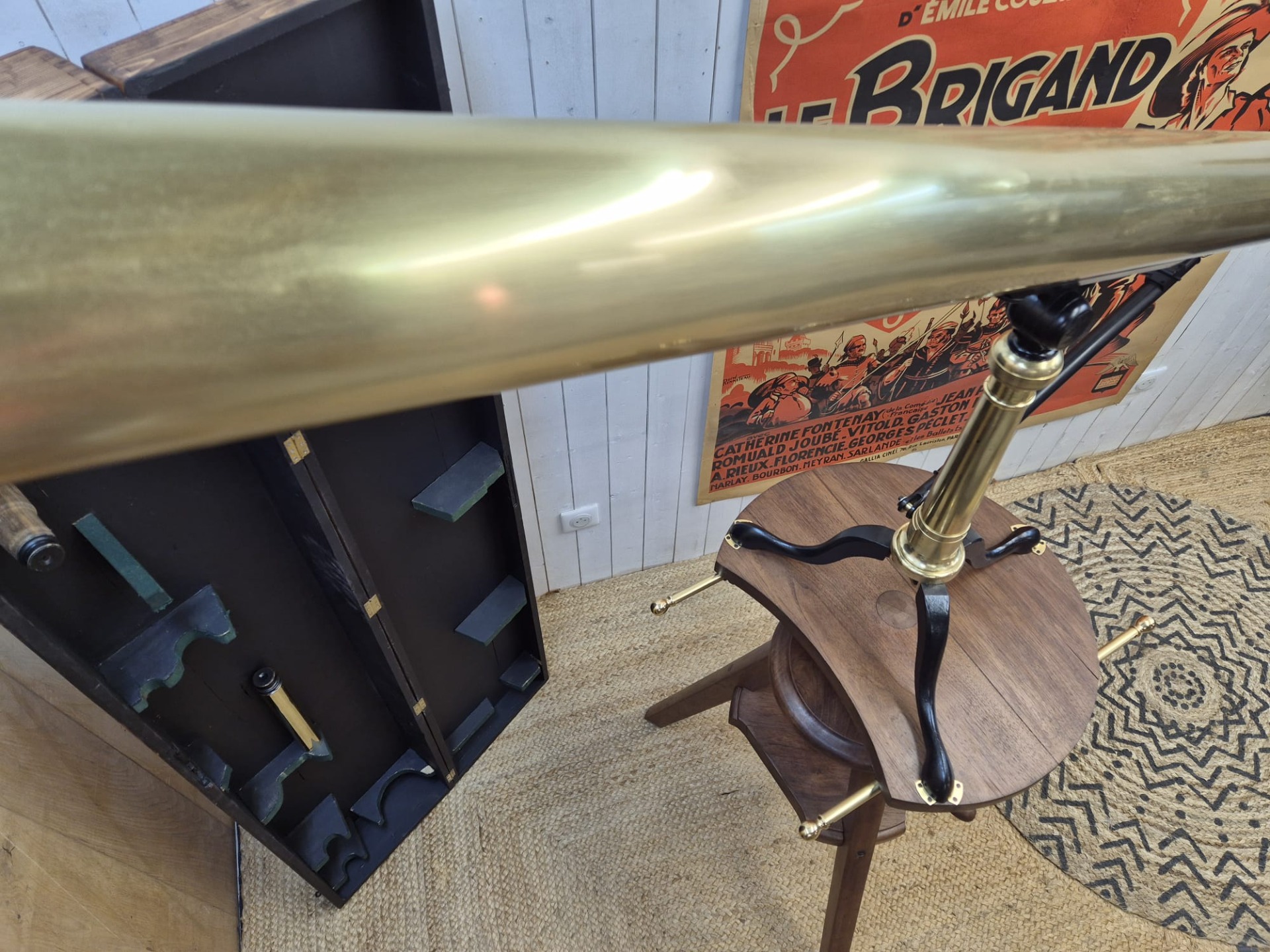 The set is incredibly and fully restored (telescope and stand) and functional. The telescope is made of brass and the stand of walnut.