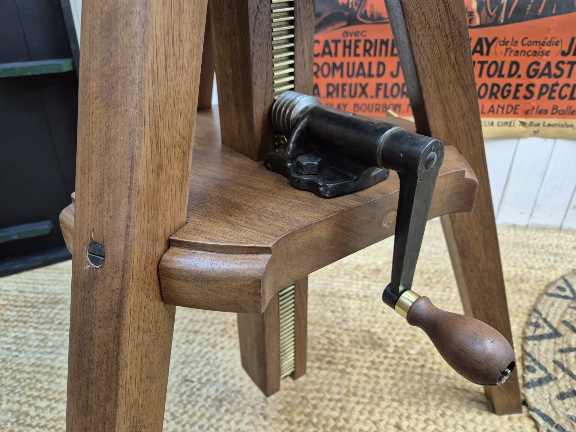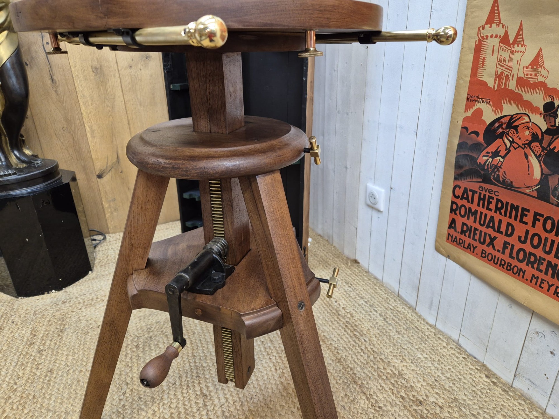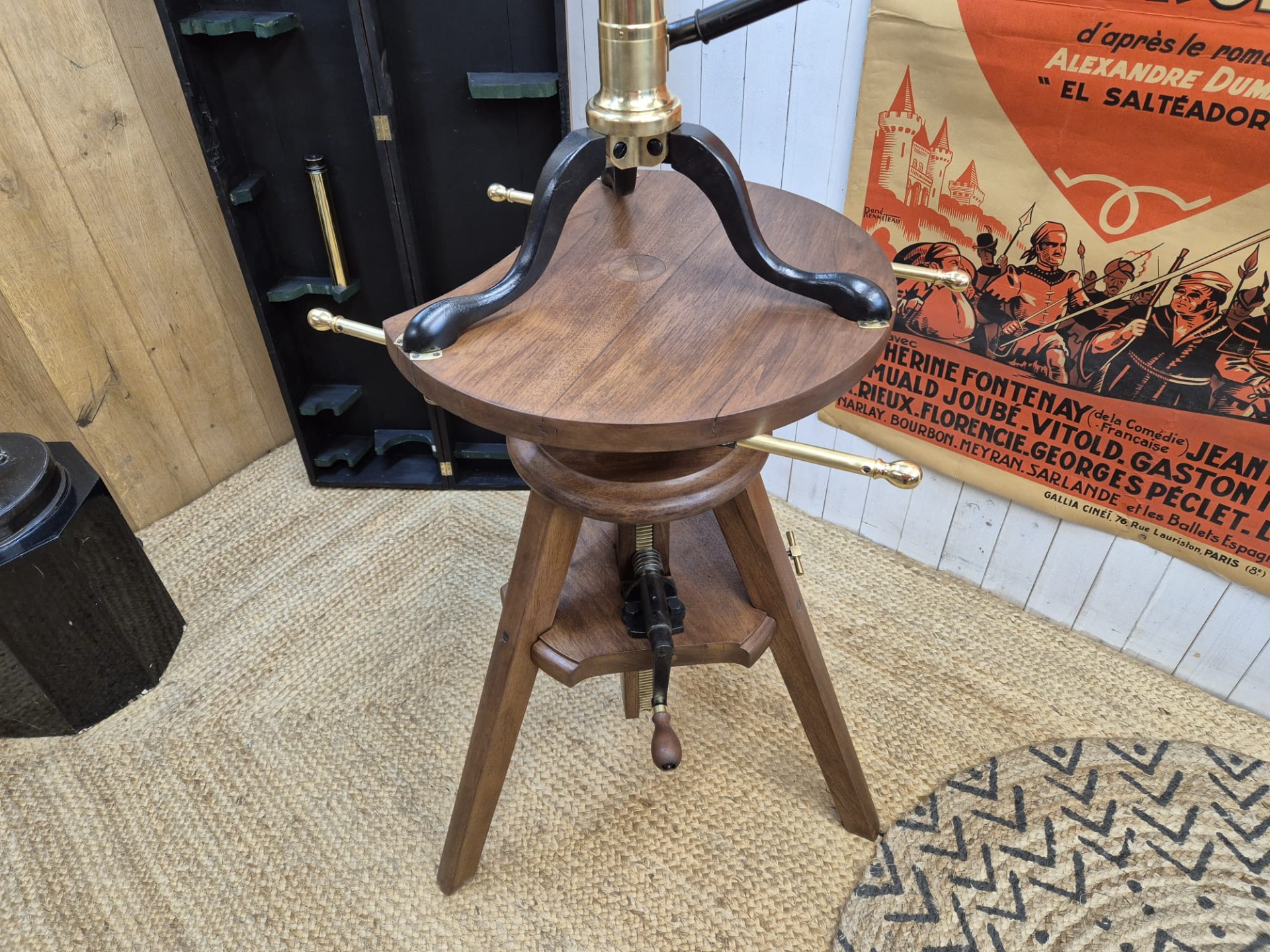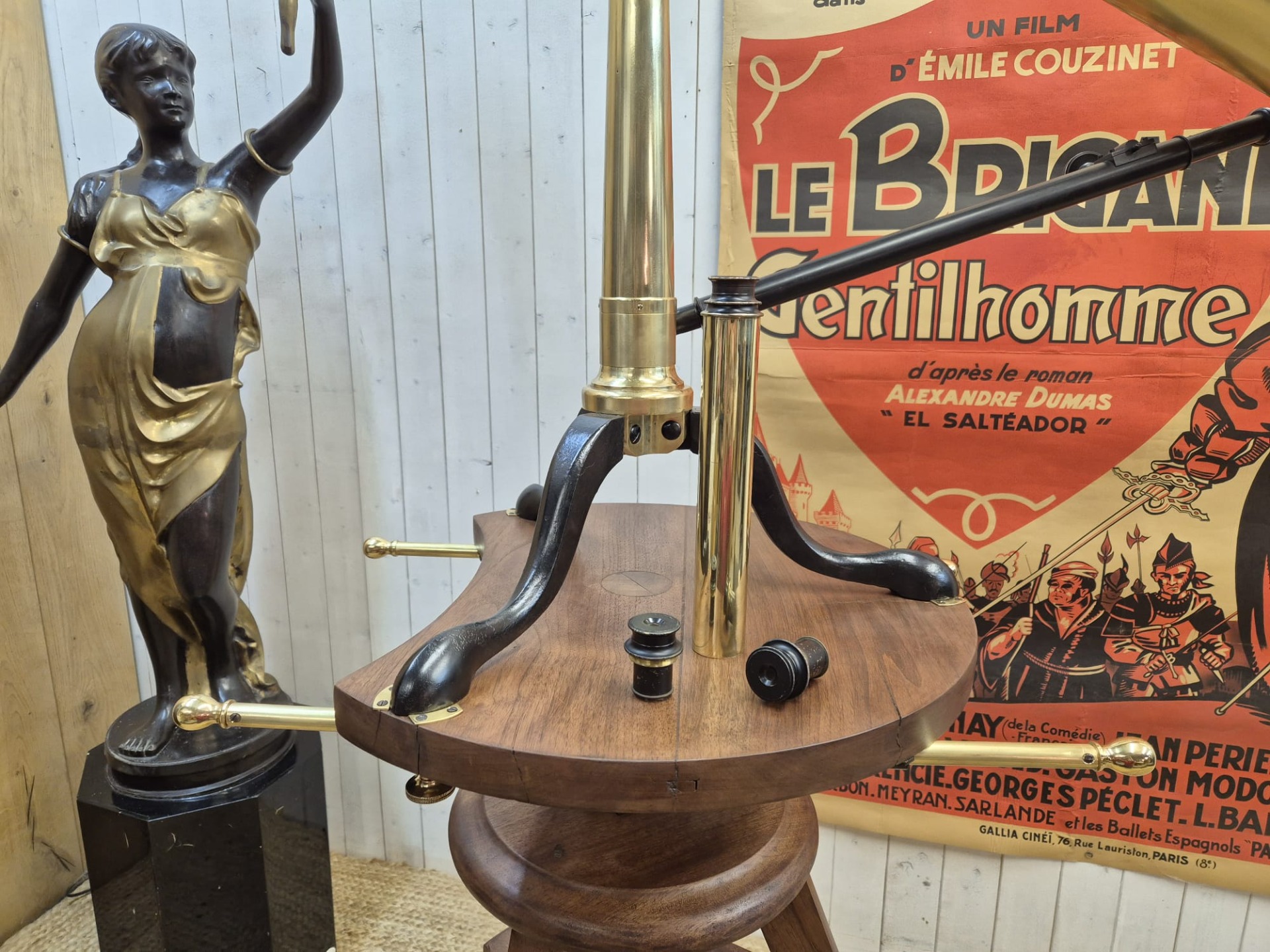 The set is incredibly and fully restored (telescope and stand) and functional. The telescope is made of brass and the stand of walnut.