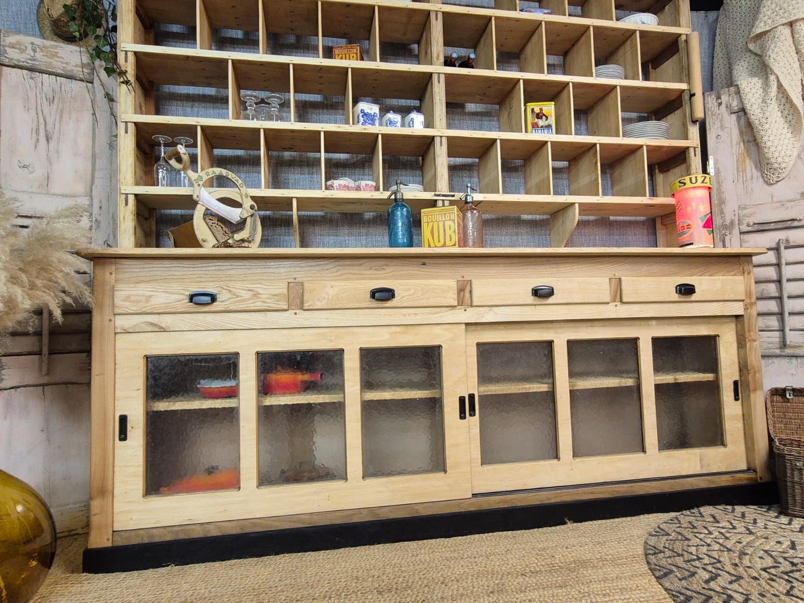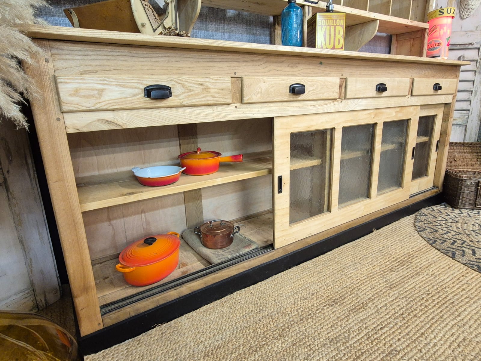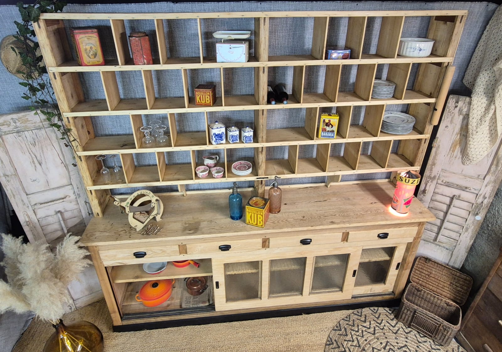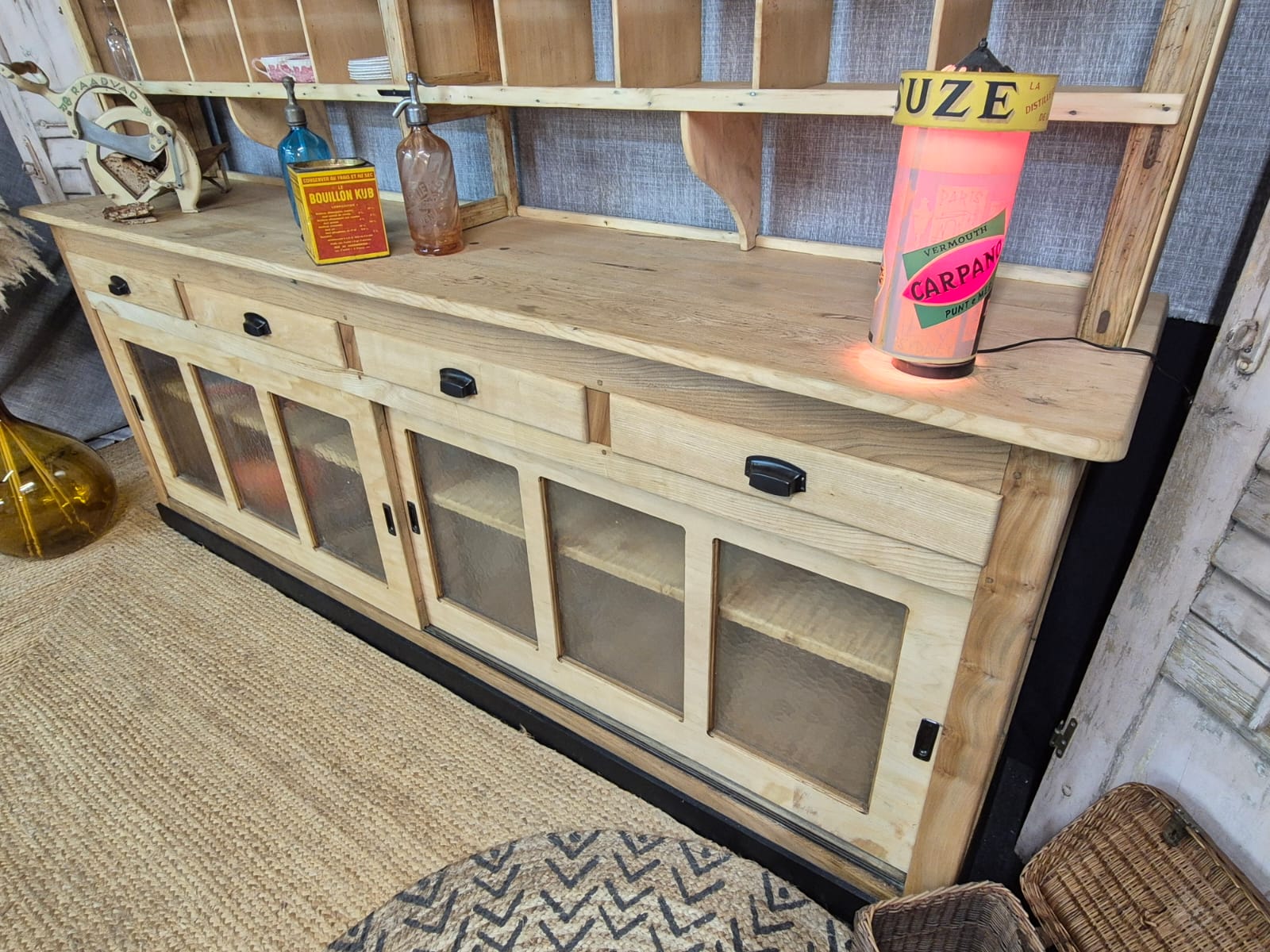 Splendid mix of wood, very decorative with its multiple compartments, it is also very practical with its glass sliding doors on the lower part. It also has 4 large drawers.
