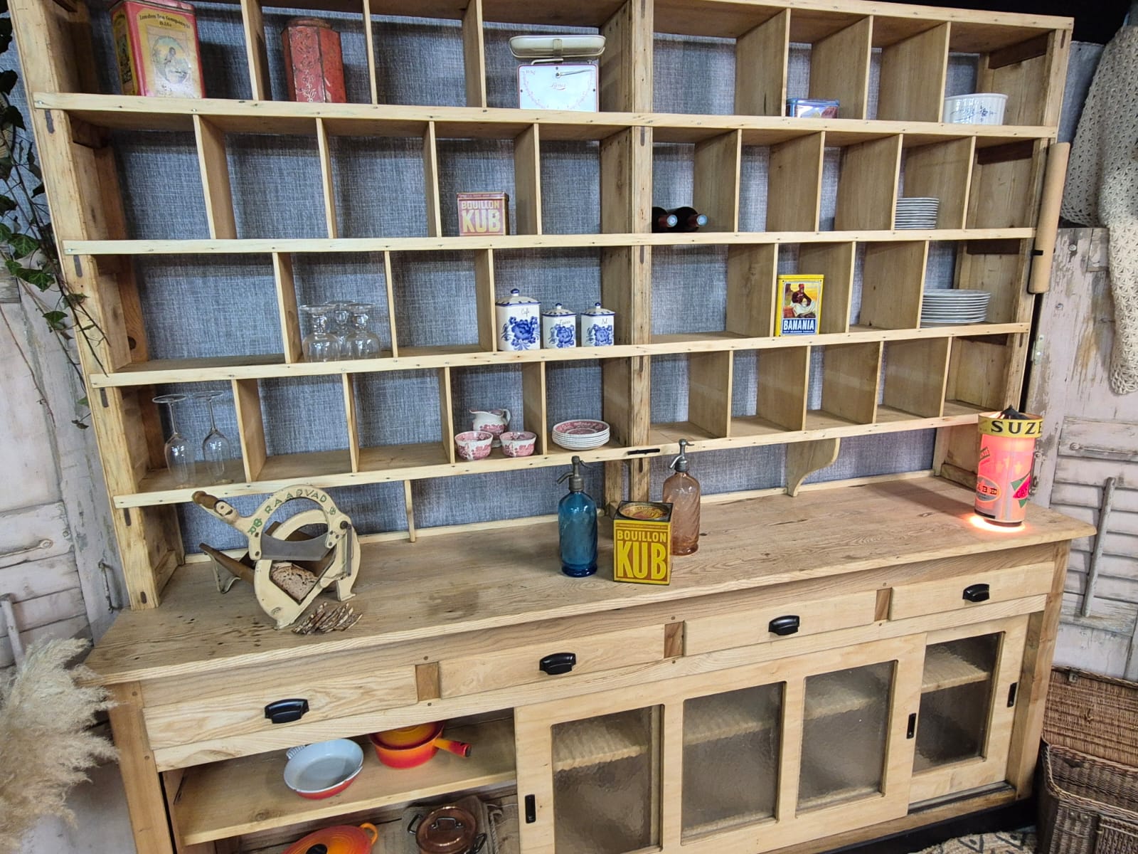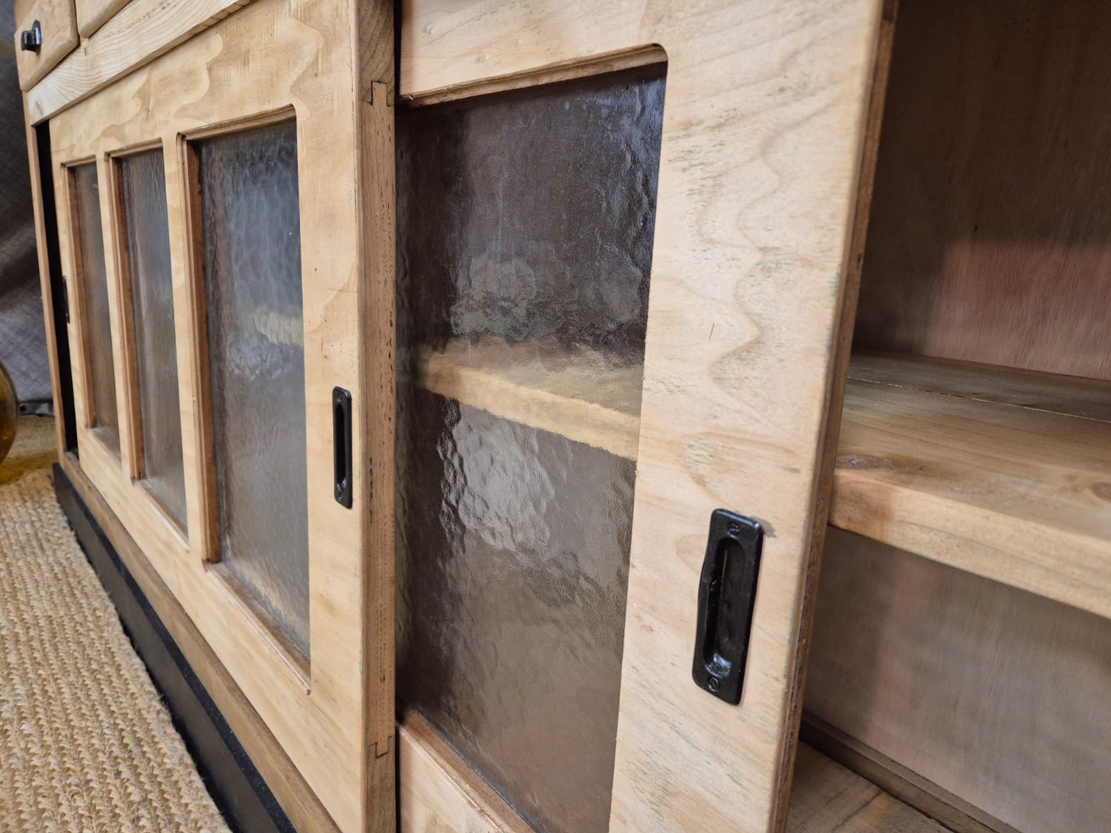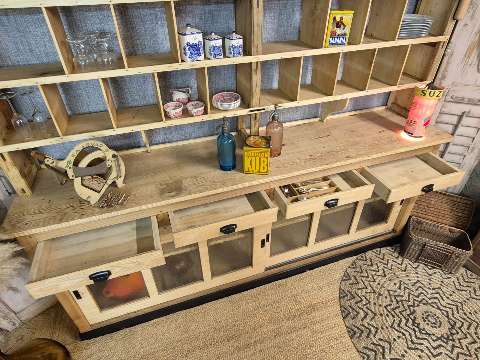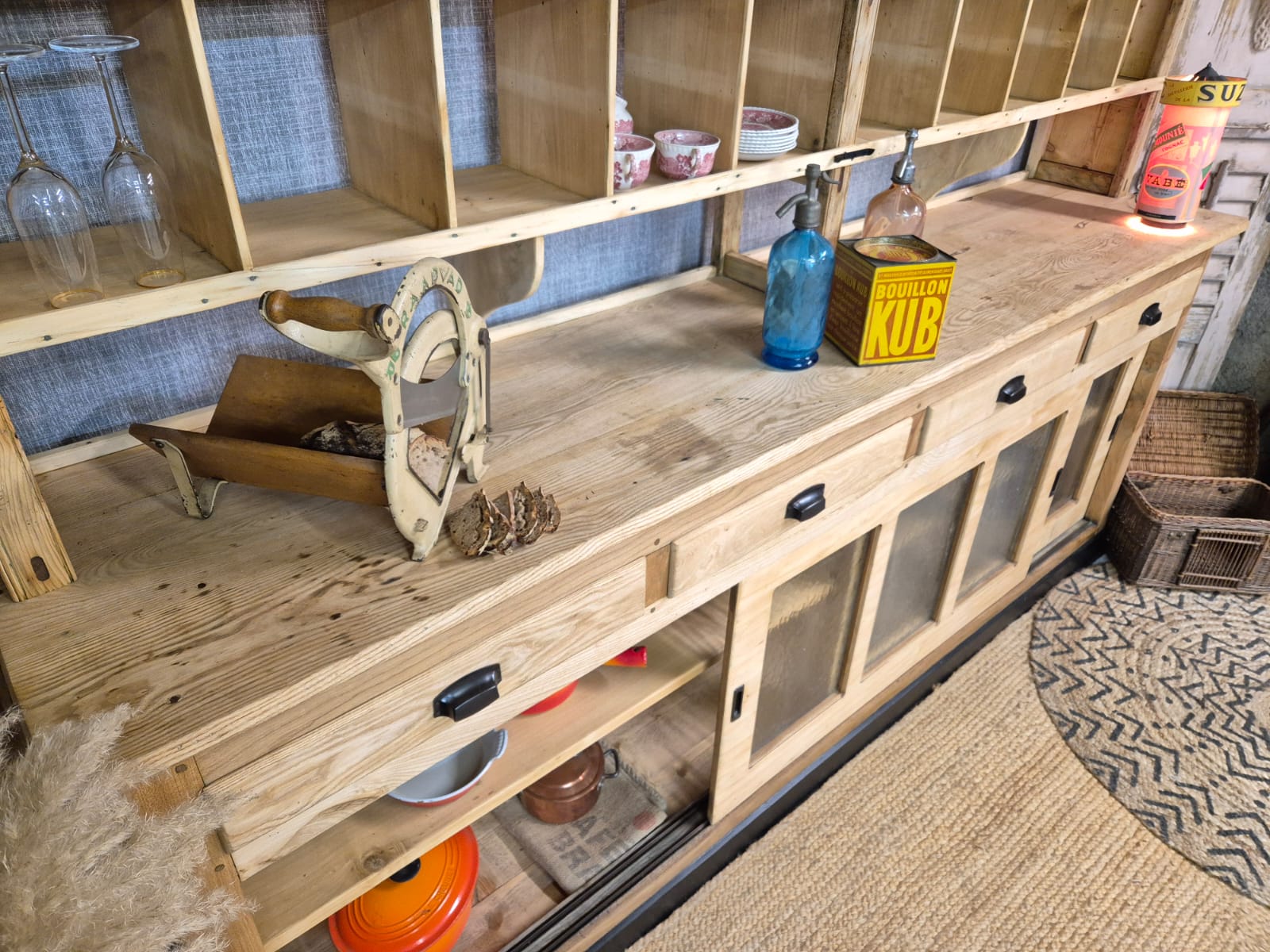 Splendid mix of wood, very decorative with its multiple compartments, it is also very practical with its glass sliding doors on the lower part. It also has 4 large drawers.