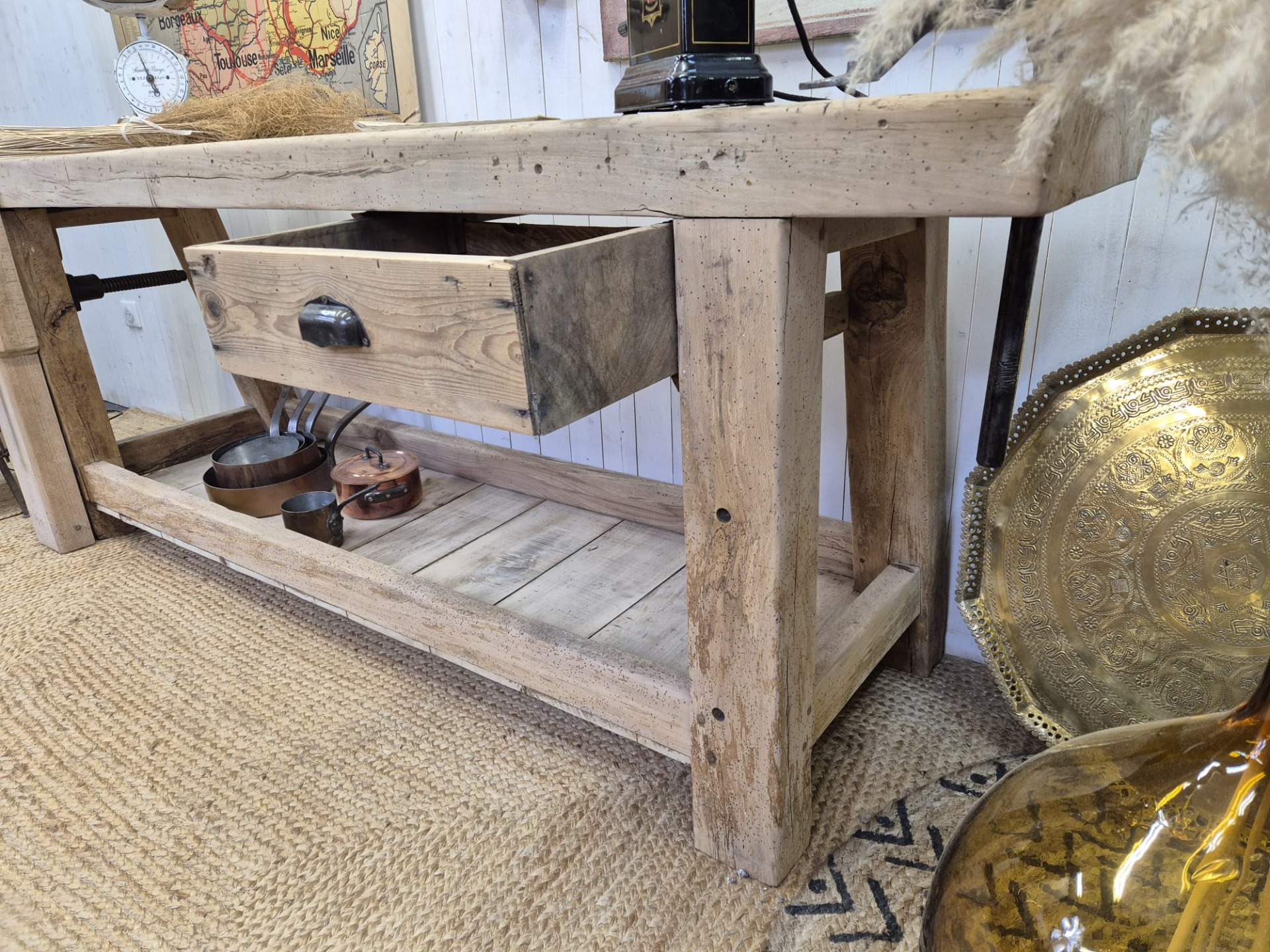 Magnifique ancien établi de menuisier en hêtre massif.