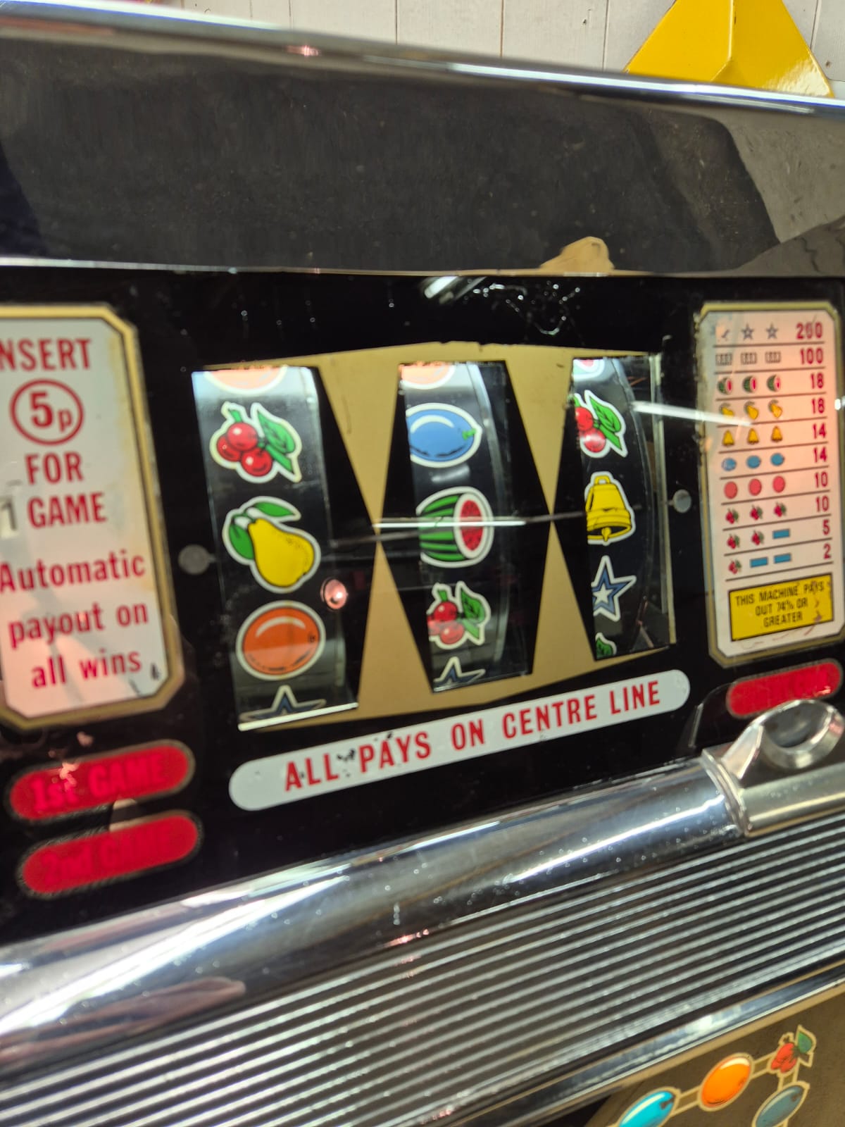 Première machine à sous électromécanique créée par Bally en 1963, elle est en très bel état général et fonctionnelle! Elle a été entièrement nettoyée, révisée et fonctionne comme à son premier jour.