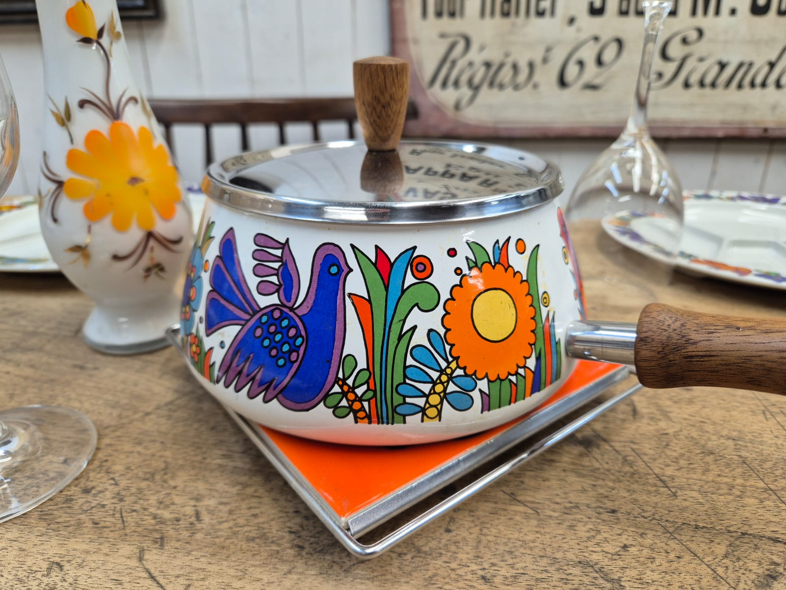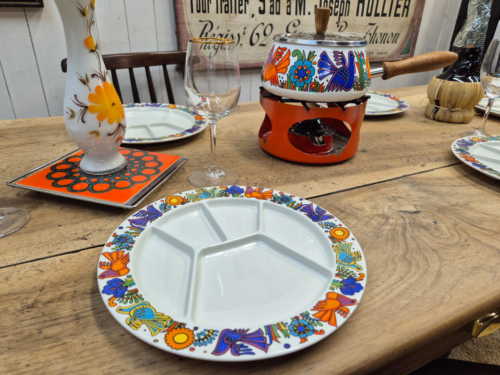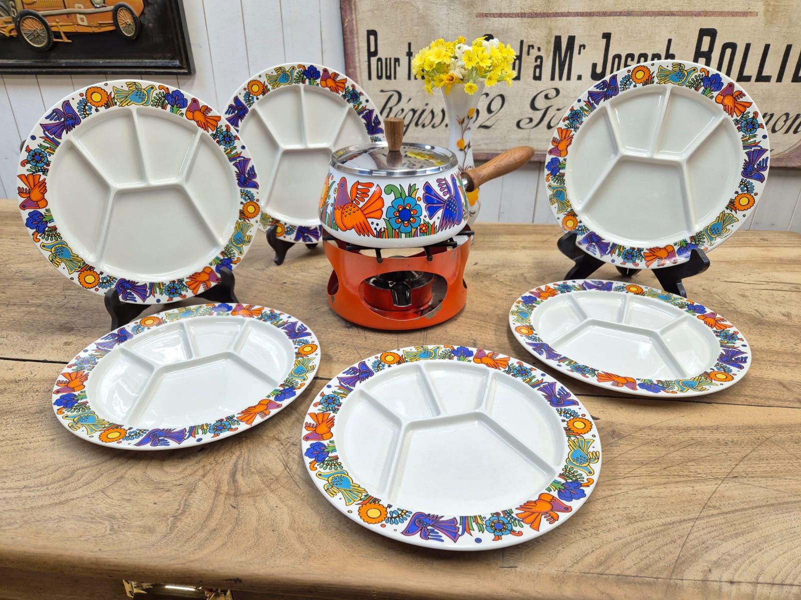 Magnifique service à fondue modèle ACAPULCO de Villeroy & Boch composé de 6 assiettes à fondue, d'un caquelon et d'un brûleur STAUB de la même époque.