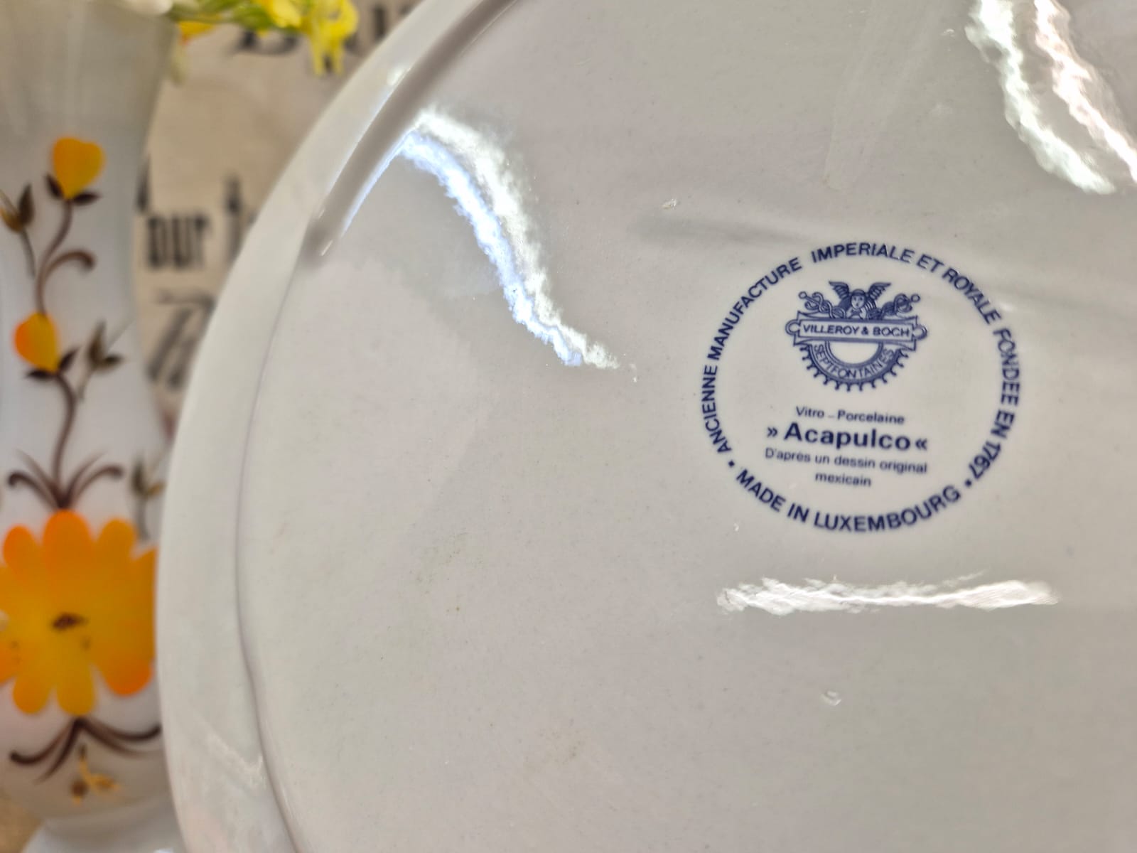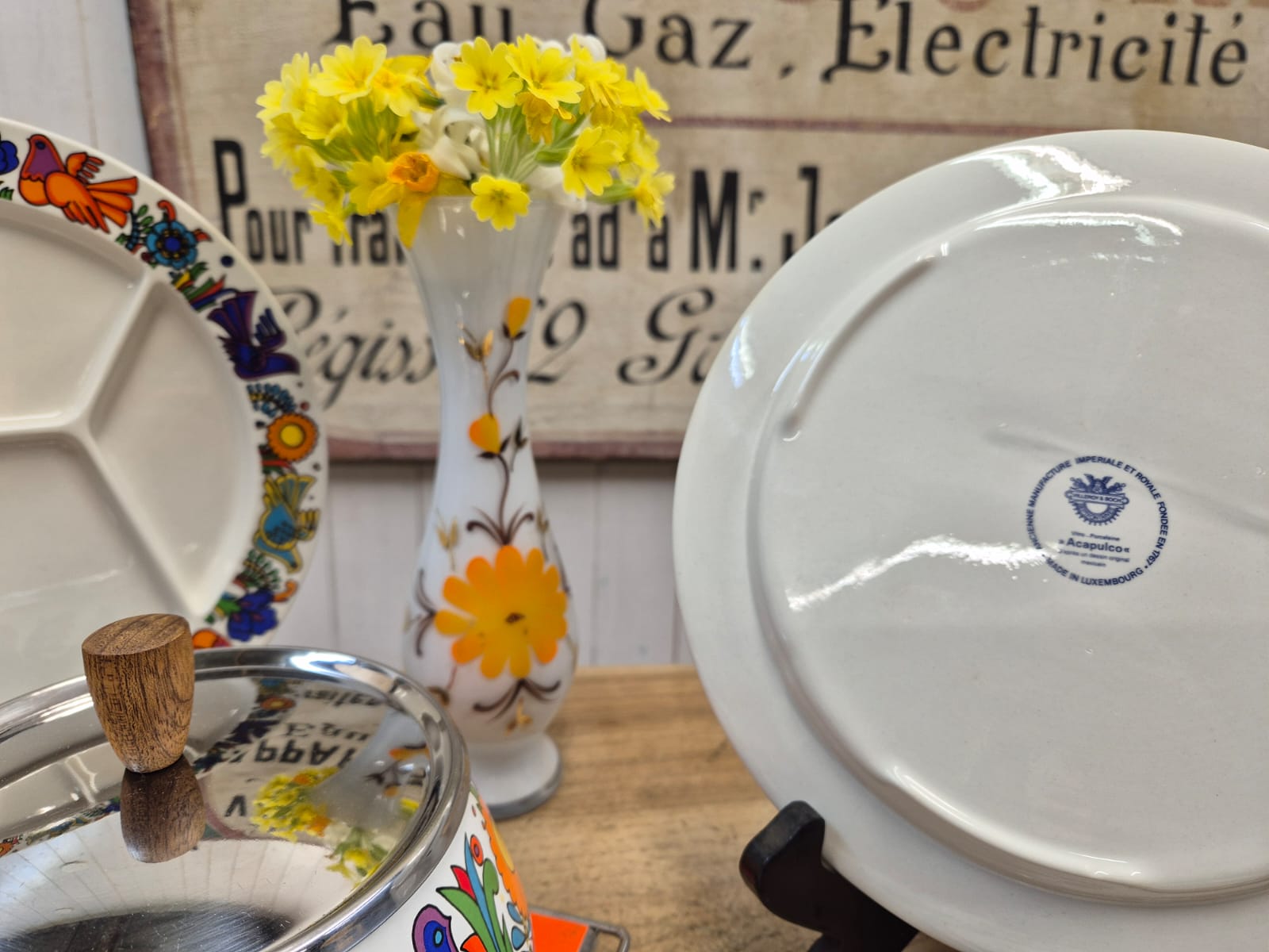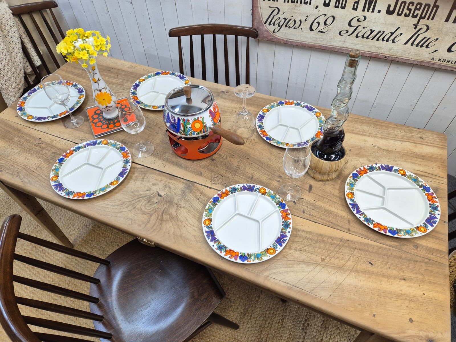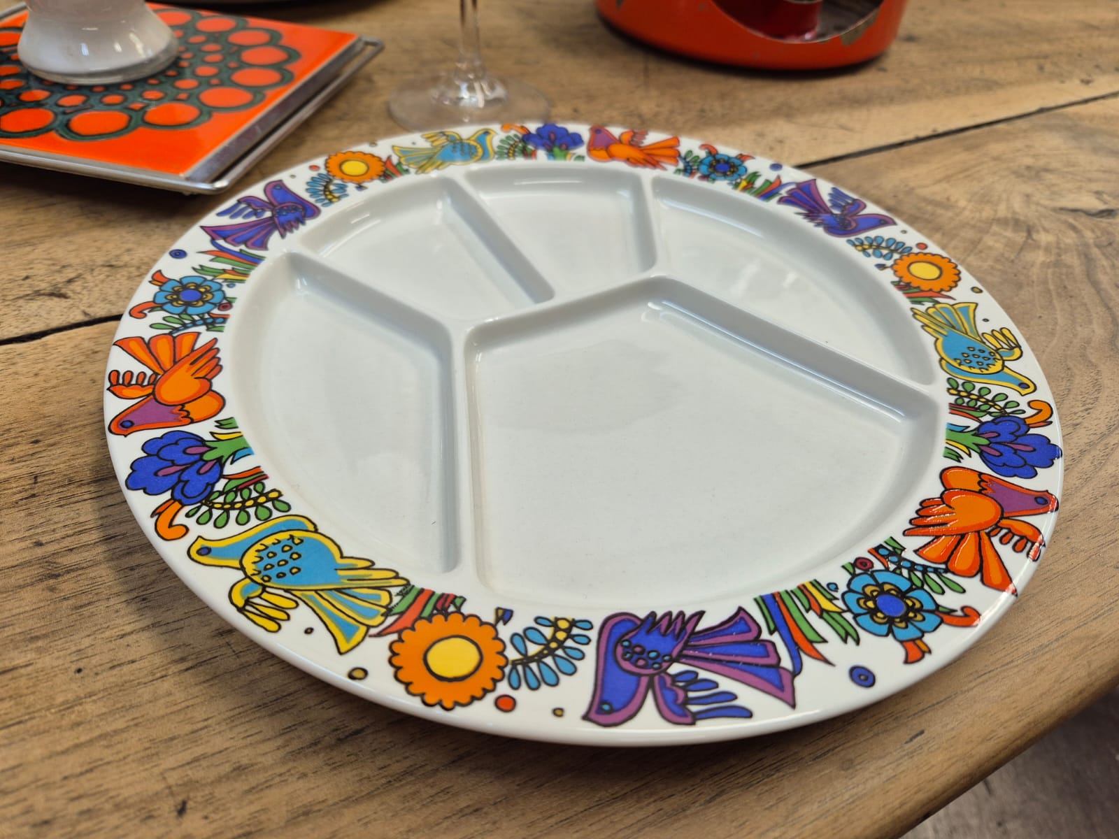 Magnifique service à fondue modèle ACAPULCO de Villeroy & Boch composé de 6 assiettes à fondue, d'un caquelon et d'un brûleur STAUB de la même époque.