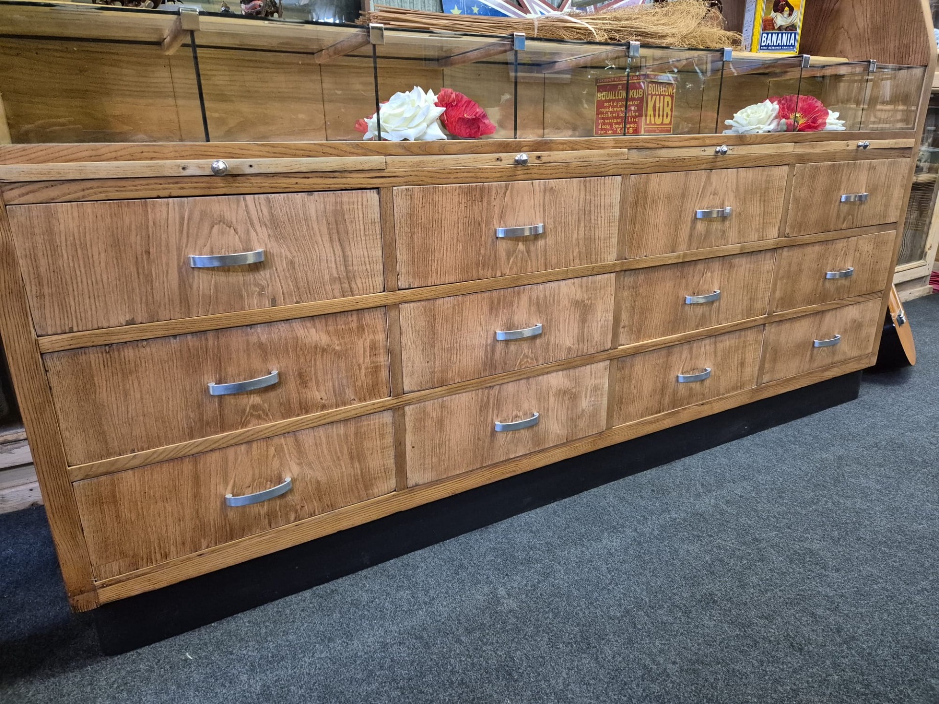 Meuble de boulangerie entièrement restauré. Très déco avec ses présentoirs à bonbons et son miroir au mercrure. il dispose également de 12 grands tiroirs et de 4 tablettes. L'ensemble du meuble est vernis.