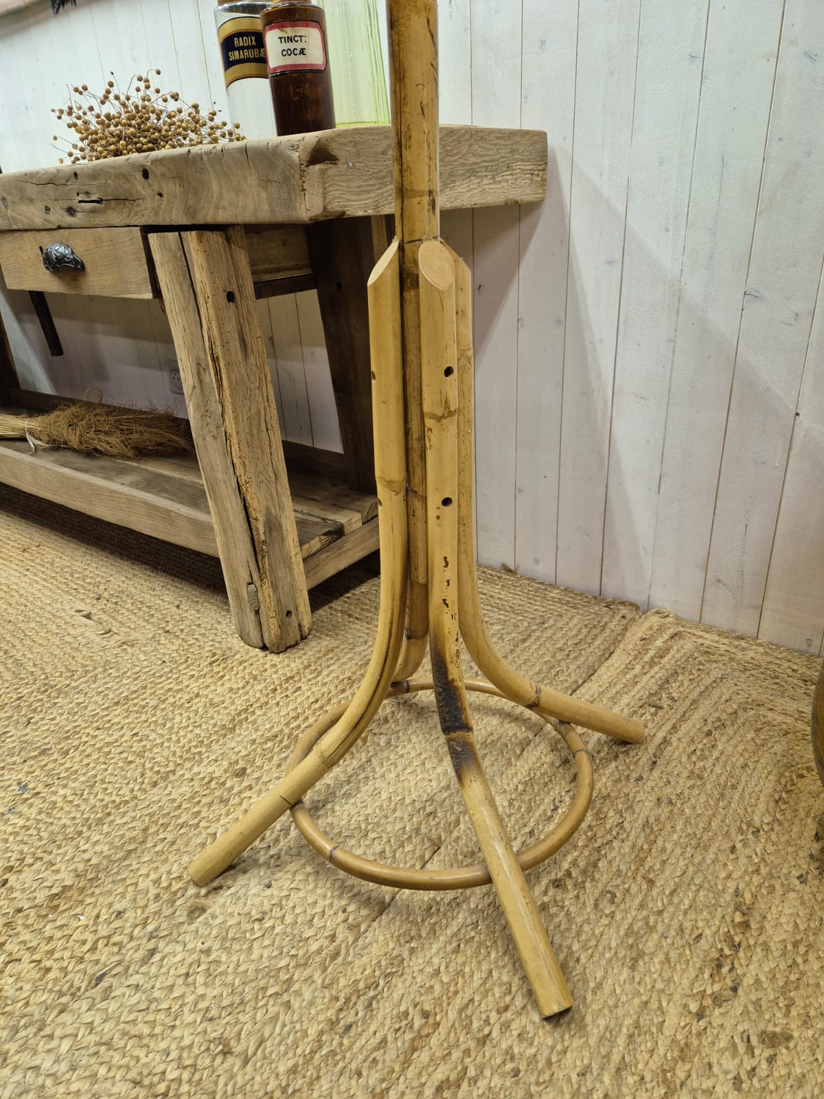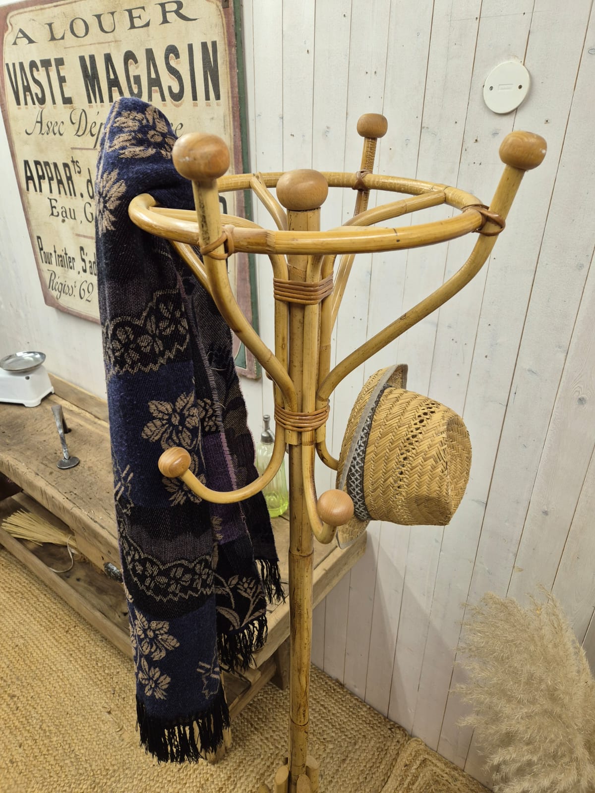 Porte-manteaux en rotin des années 70.Joli travail du rotin tout en courbes et finesse, bon état général.Dimensions :Hauteur : 180cmDiamètre : 46cm