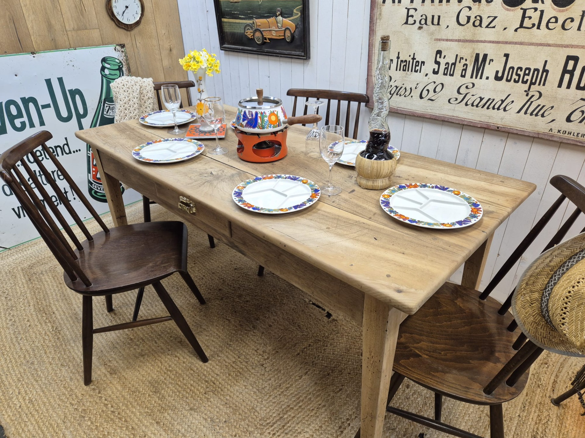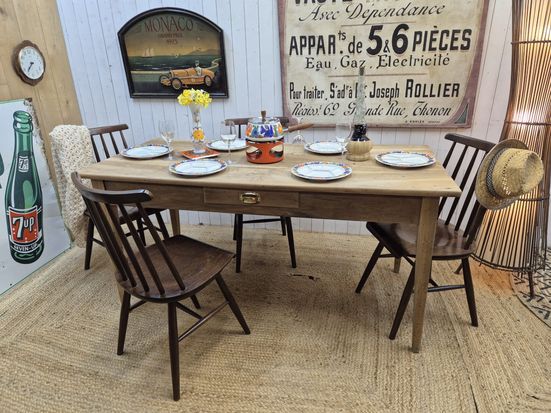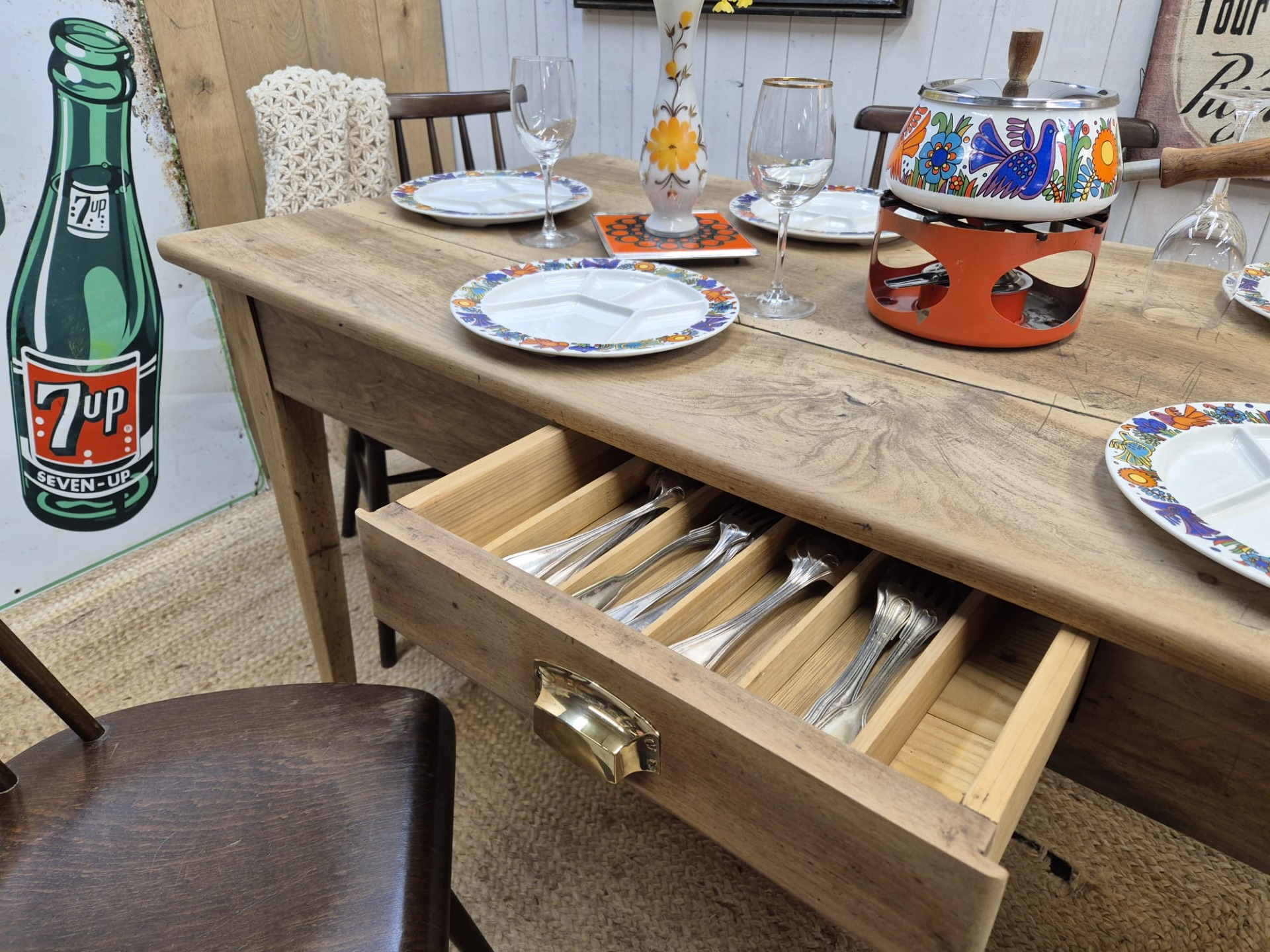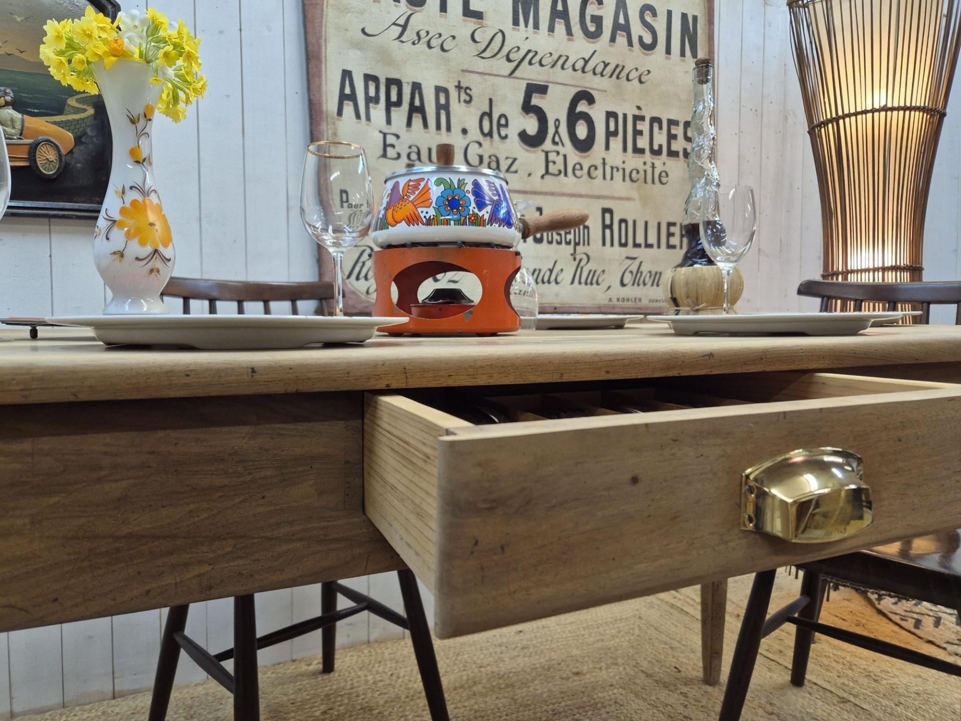 Pretty small farmhouse table in solid walnut. It has a drawer with its original brass shell handle. Very practical with its dimensions, it is also full of charm with a beautiful aging effect on the wood. Dimensions: Length 157cm Width 72cm Height 76cm Height under apron 60cm
