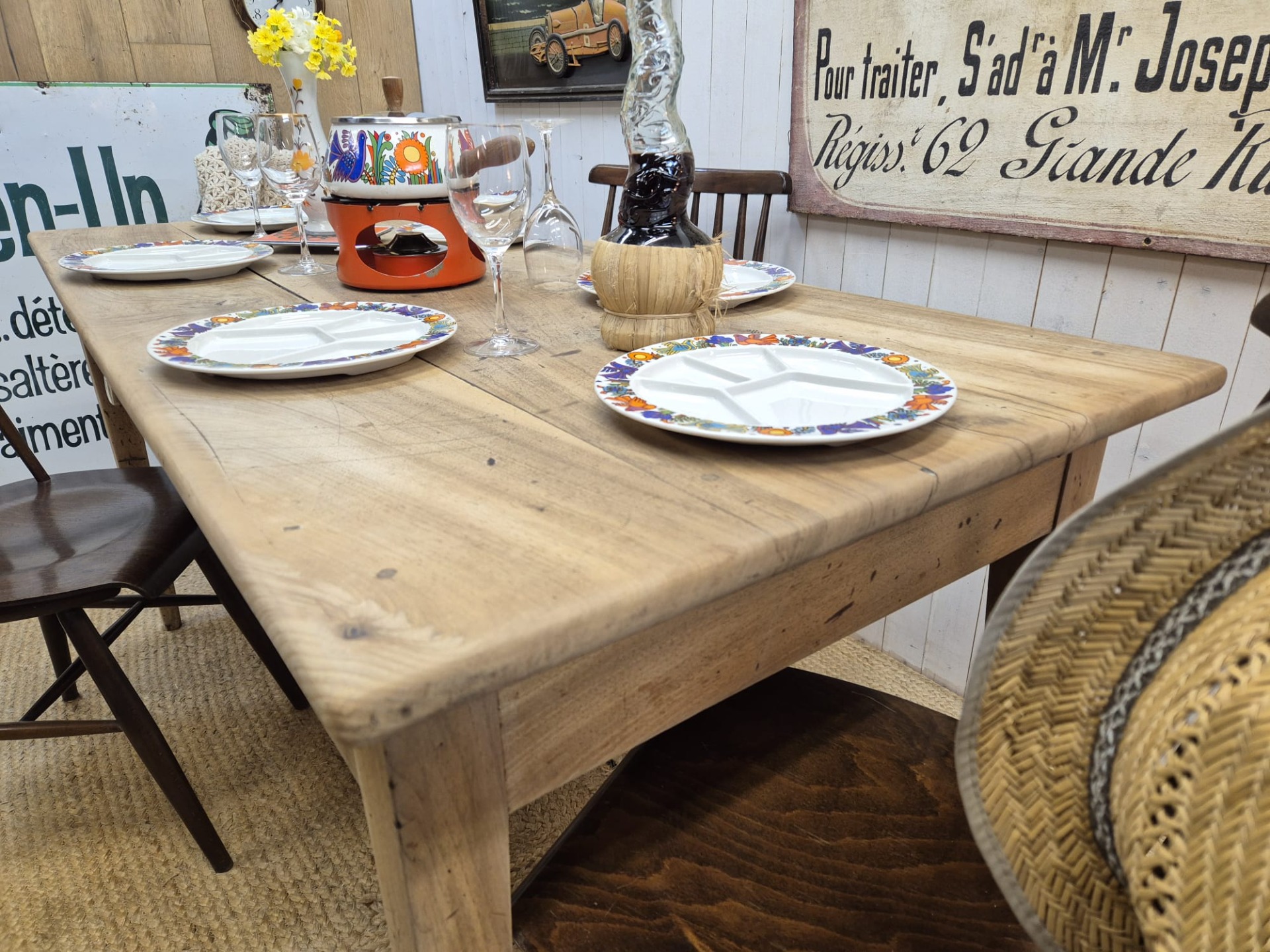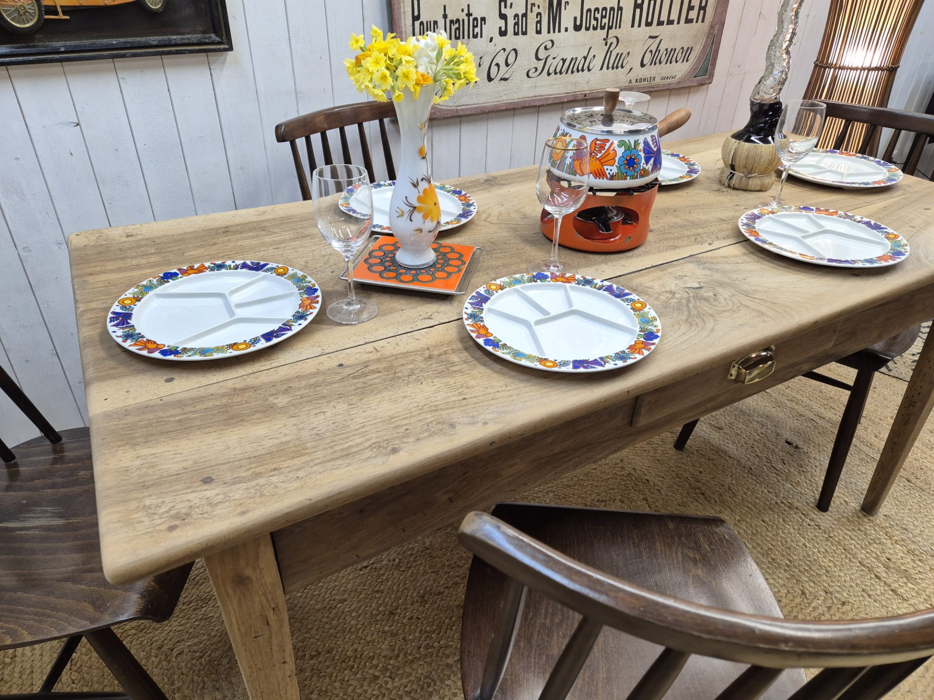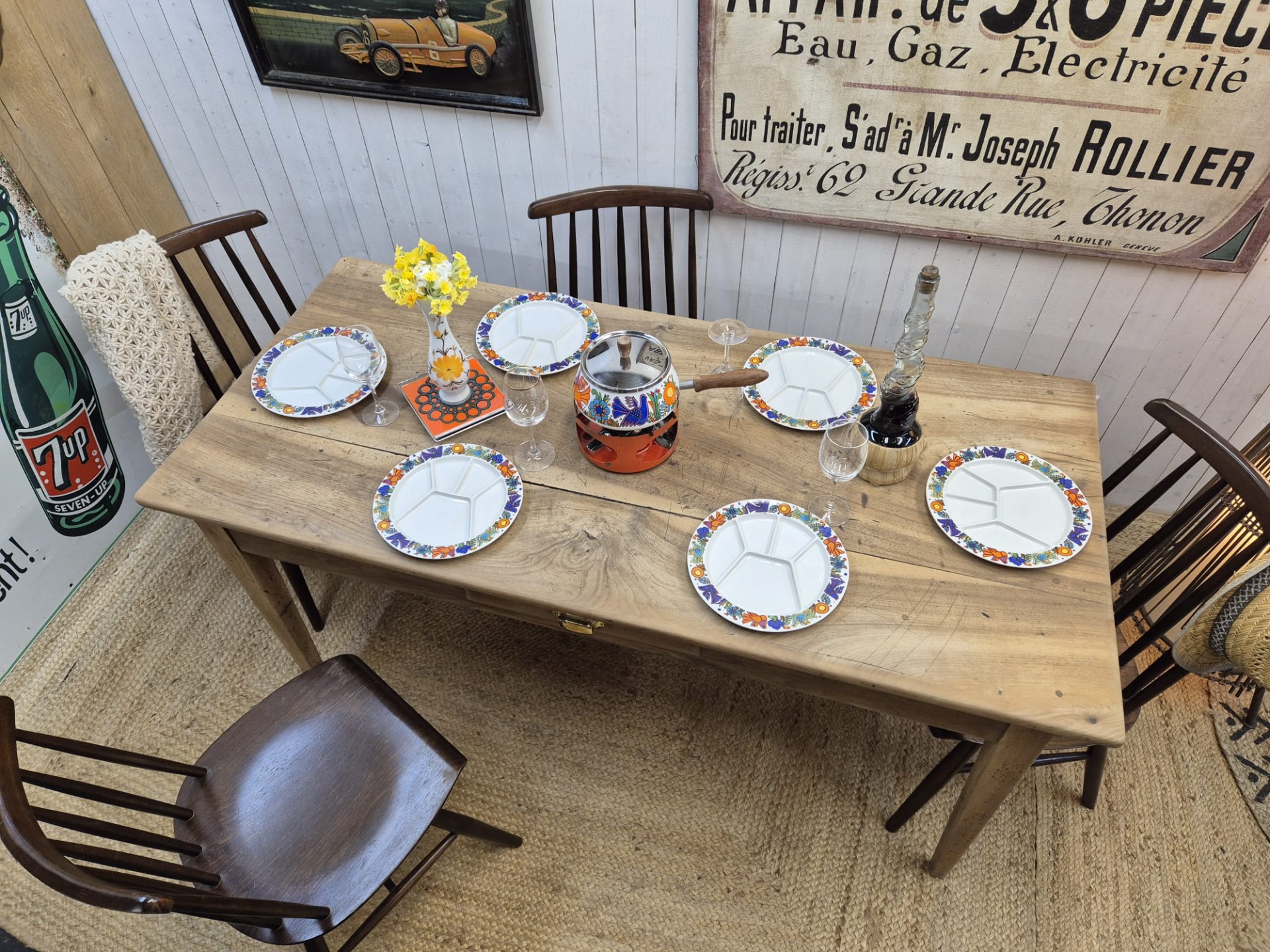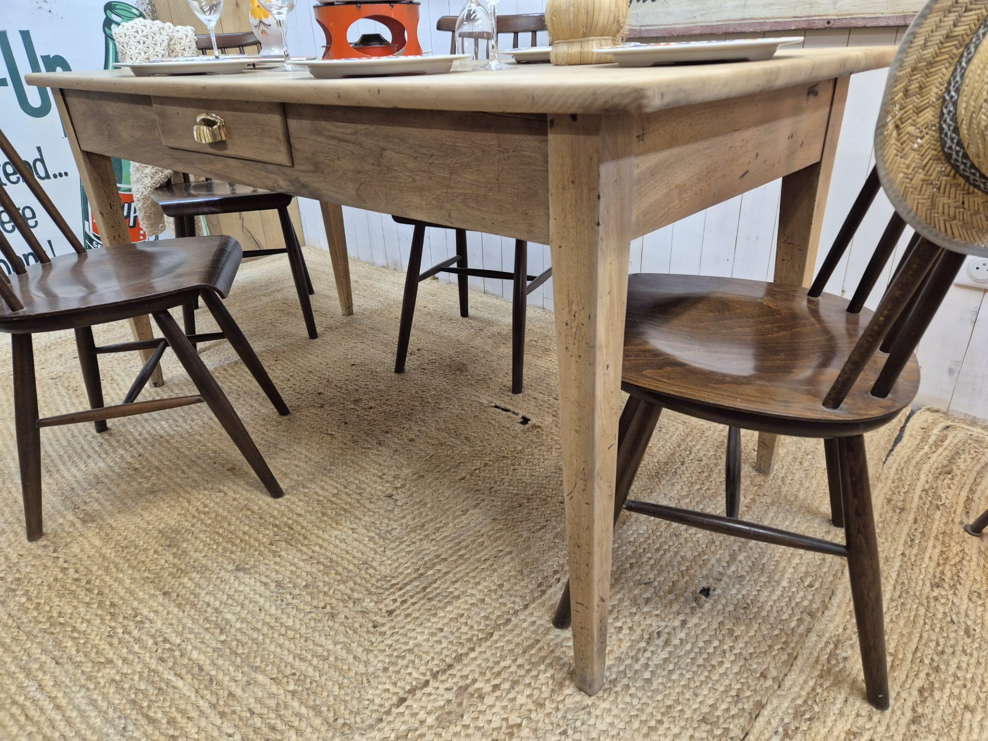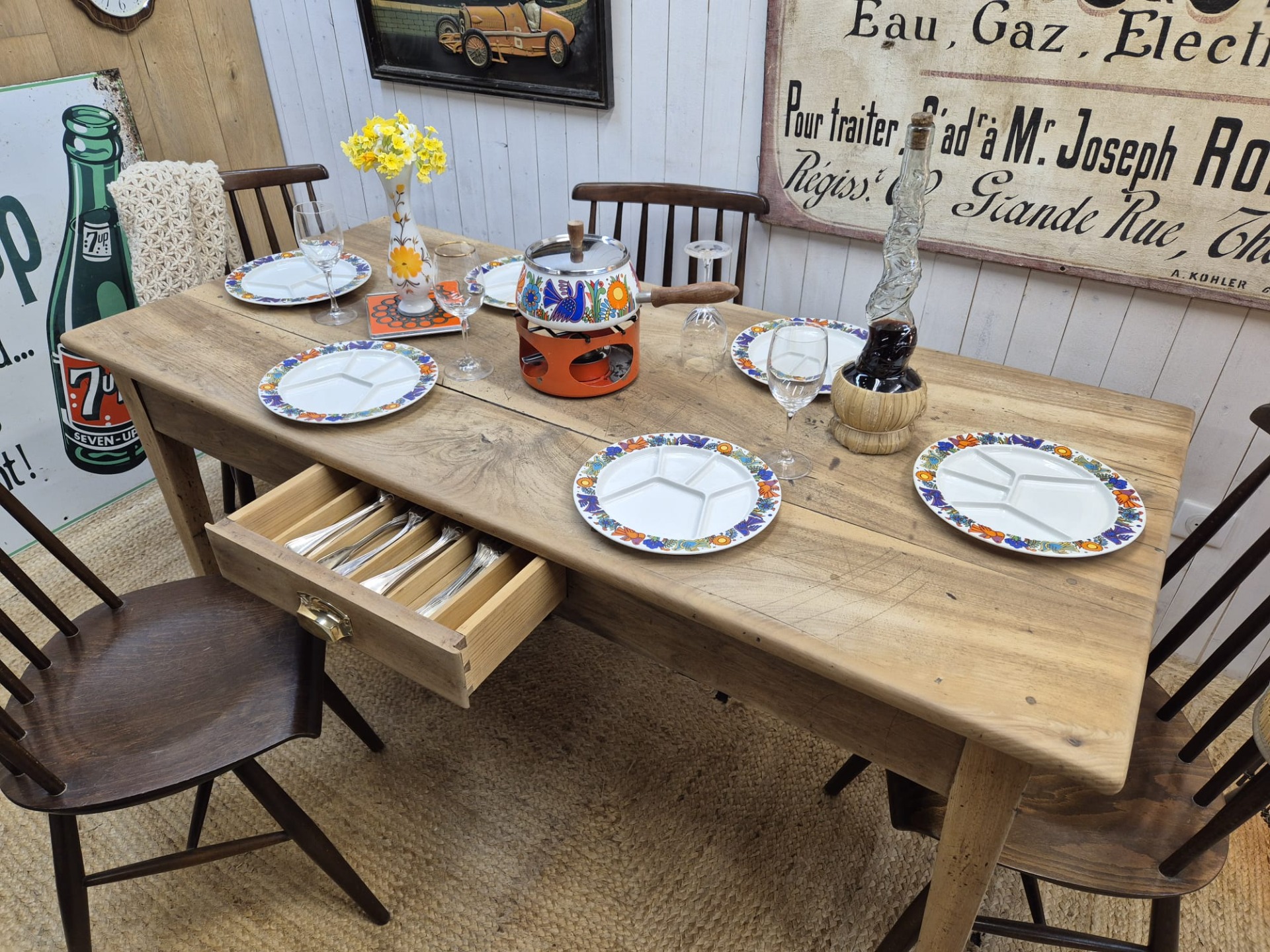 Pretty small farmhouse table in solid walnut. It has a drawer with its original brass shell handle. Very practical with its dimensions, it is also full of charm with a beautiful aging effect on the wood. Dimensions: Length 157cm Width 72cm Height 76cm Height under apron 60cm