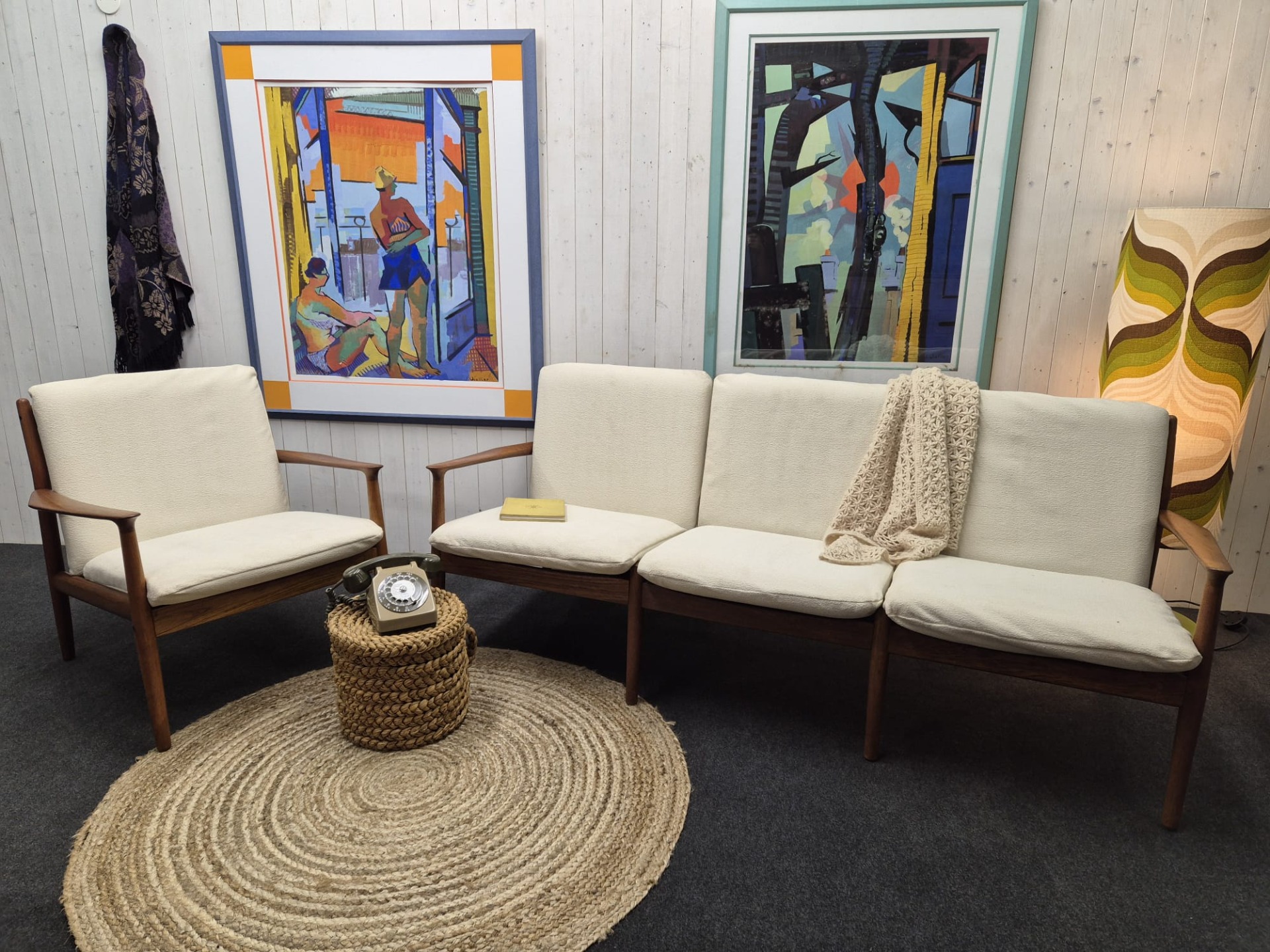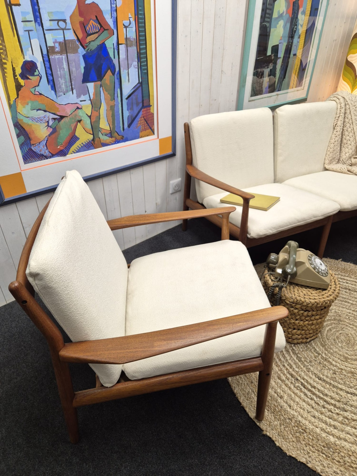 Magnifique ensemble canapé et fauteuil scandinave en teck conçu par Svend Age Eriksen (modèle GM5) pour Glostrup Mobelfabrik, années 1960. Structure en teck massif. Coussins en tissu perle de coton.
