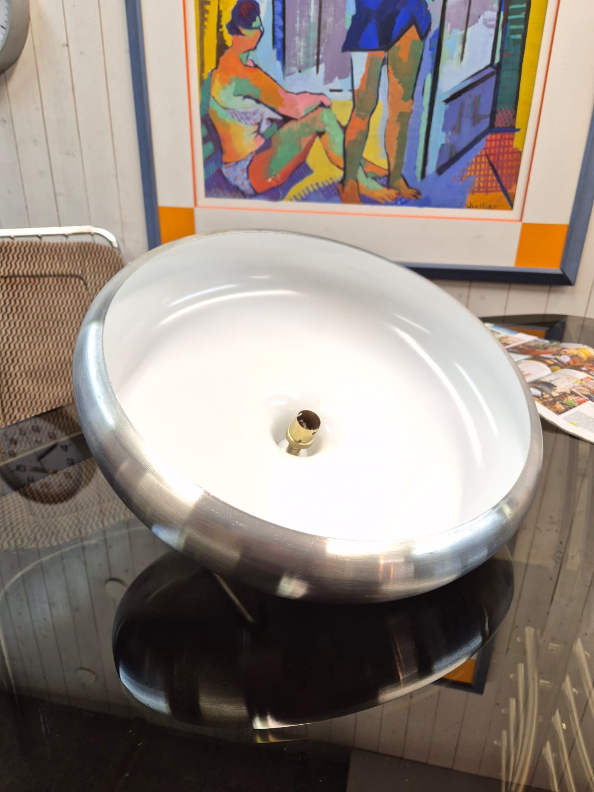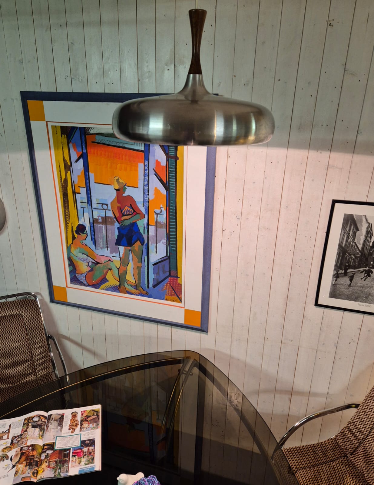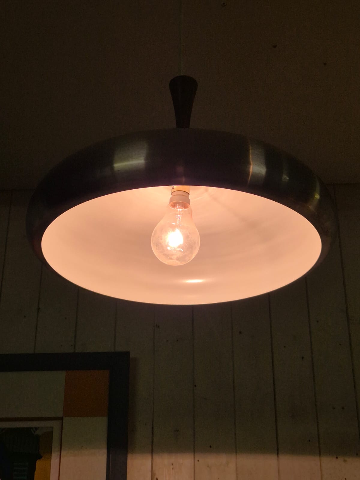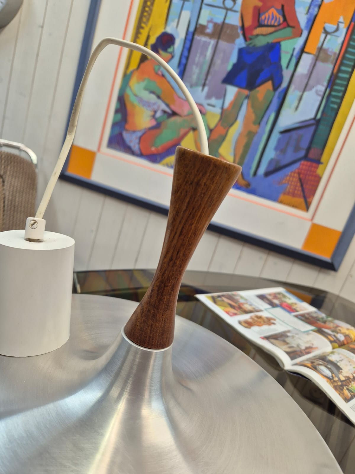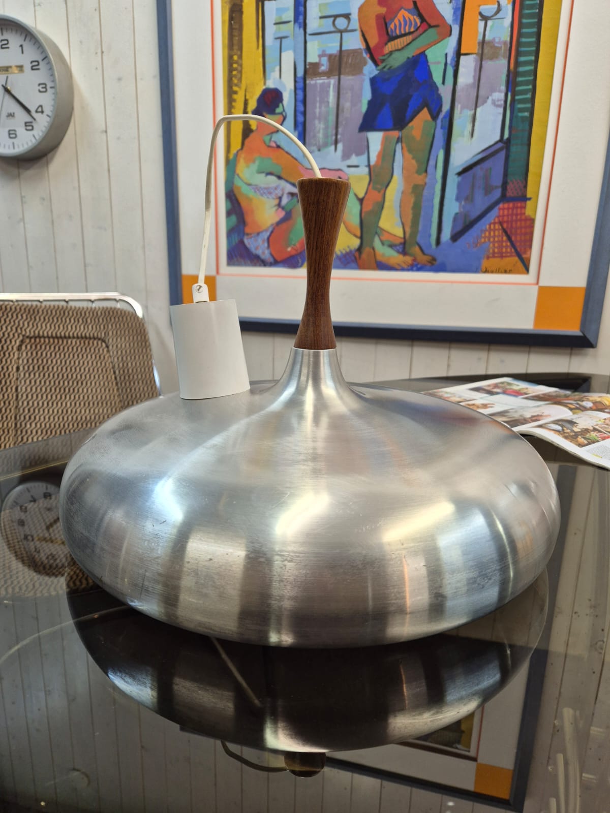 Très belle suspension scandinave en inox brossé et teck des années 60.